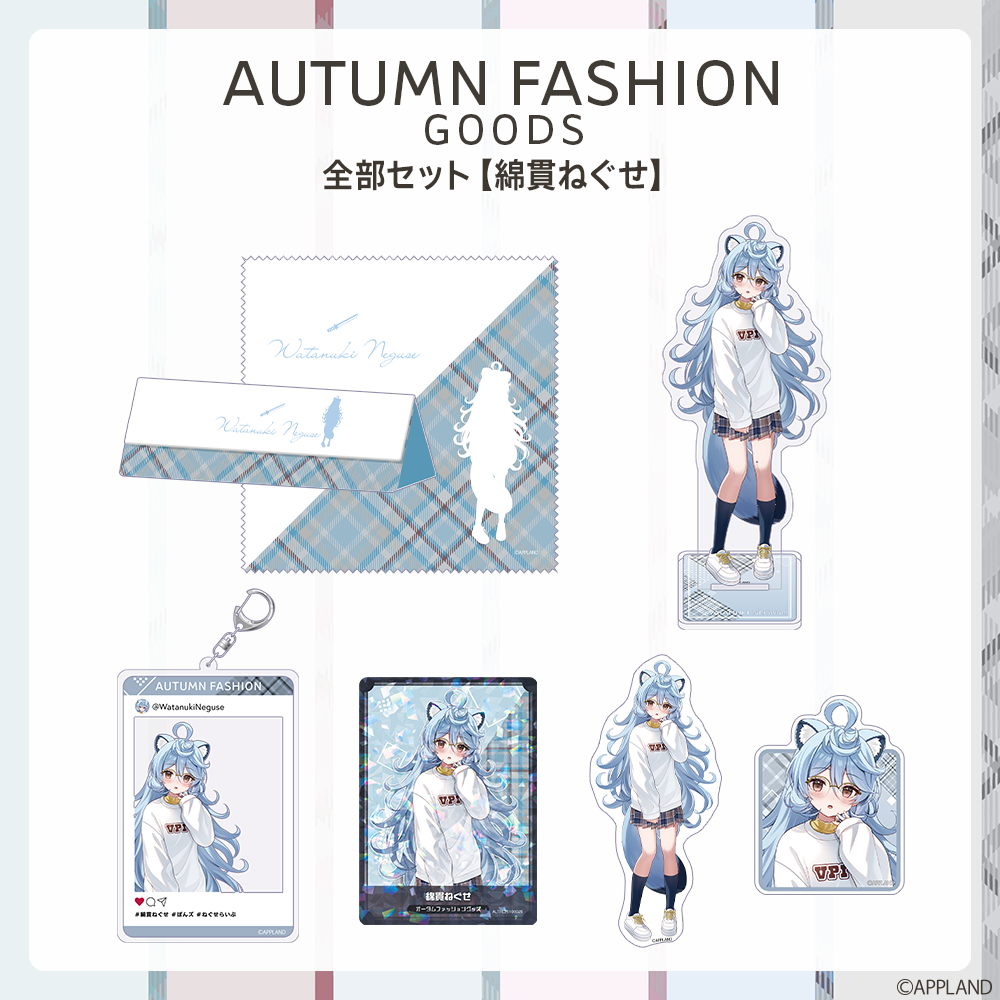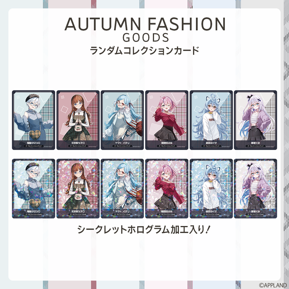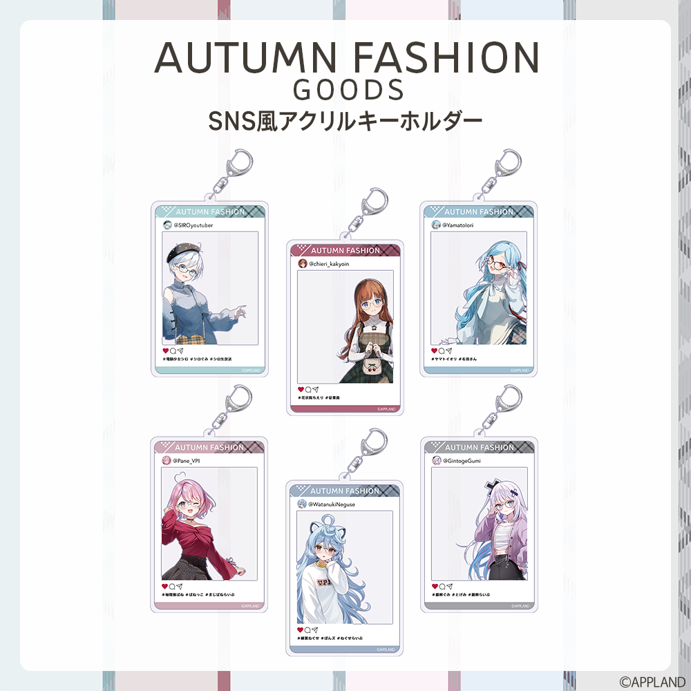 「.LIVE」より電脳少女シロ、花京院ちえり、ヤマト イオリ、「ぶいぱい」より秘間慈ぱね、綿貫ねぐせ、銀棘ぐみの描き下ろしイラストを使用した『アップランドオータムファッショングッズ』を当社が運営する公式グッズ販売サイト(APPLAND OFFICIAL SHOP)にて2025年11月18日(火)より販売いたします。