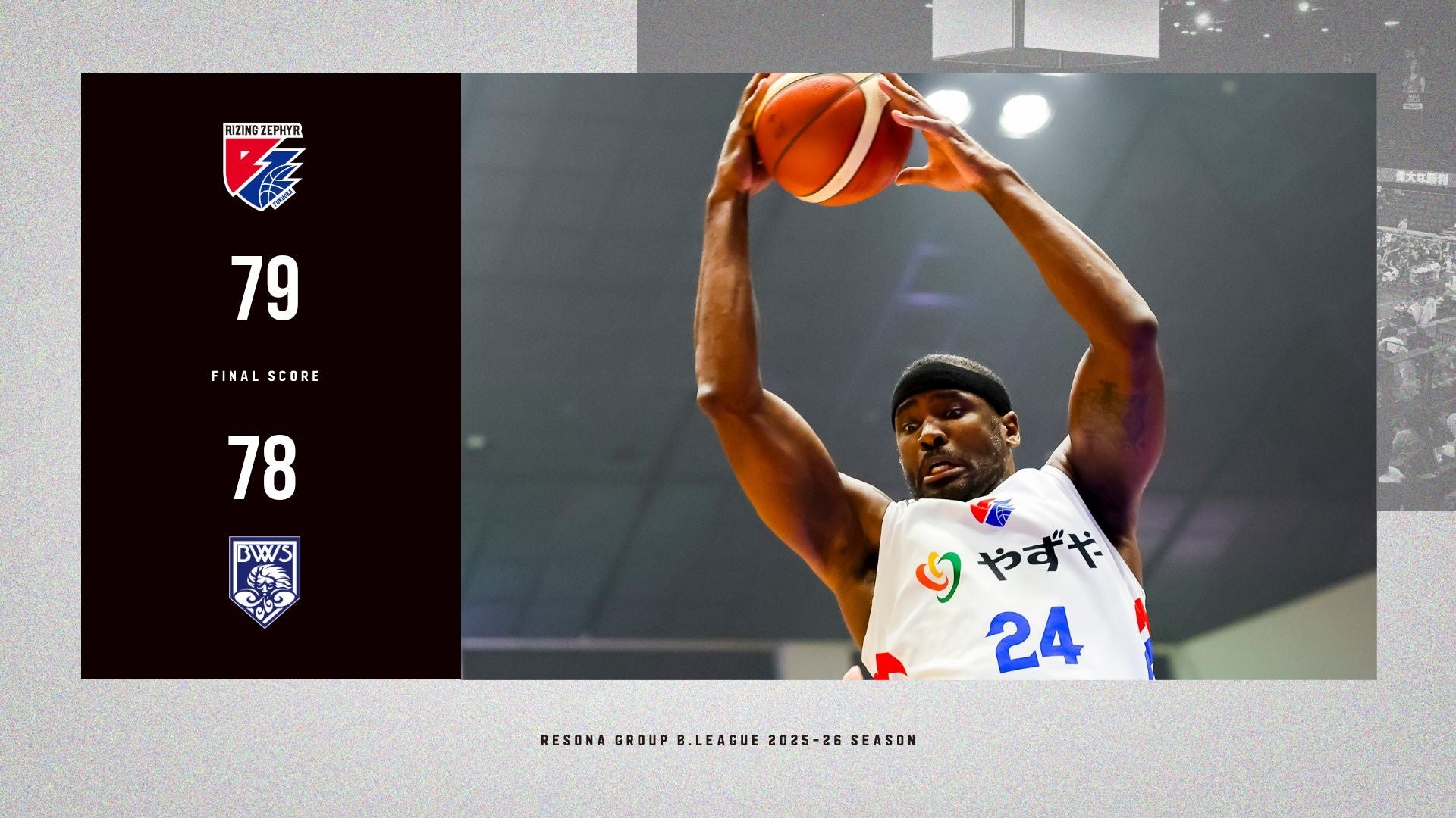 2025年11月22日(土)に開催した、りそなグループ B.LEAGUE 2025-26 シーズン【ライジングゼファーフクオカ vs.福井ブローウィンズ】戦は、“福岡 79-78 福井”で福岡の勝利となりました。
