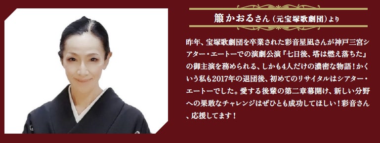 昨年、宝塚歌劇団を卒業された彩音星凪さんが神戸三宮シアター・エートーでの演劇公演『七日後、塔は燃え落ちた』の御主演を務められる、しかも4人だけの濃密な物語!かくいう私も2017年の退団後、初めてのリサイタルはシアター・エートーでした。愛する後輩の第二章幕開け、新しい分野への果敢なチャレンジはぜひとも成功してほしい!彩音さん、応援してます!