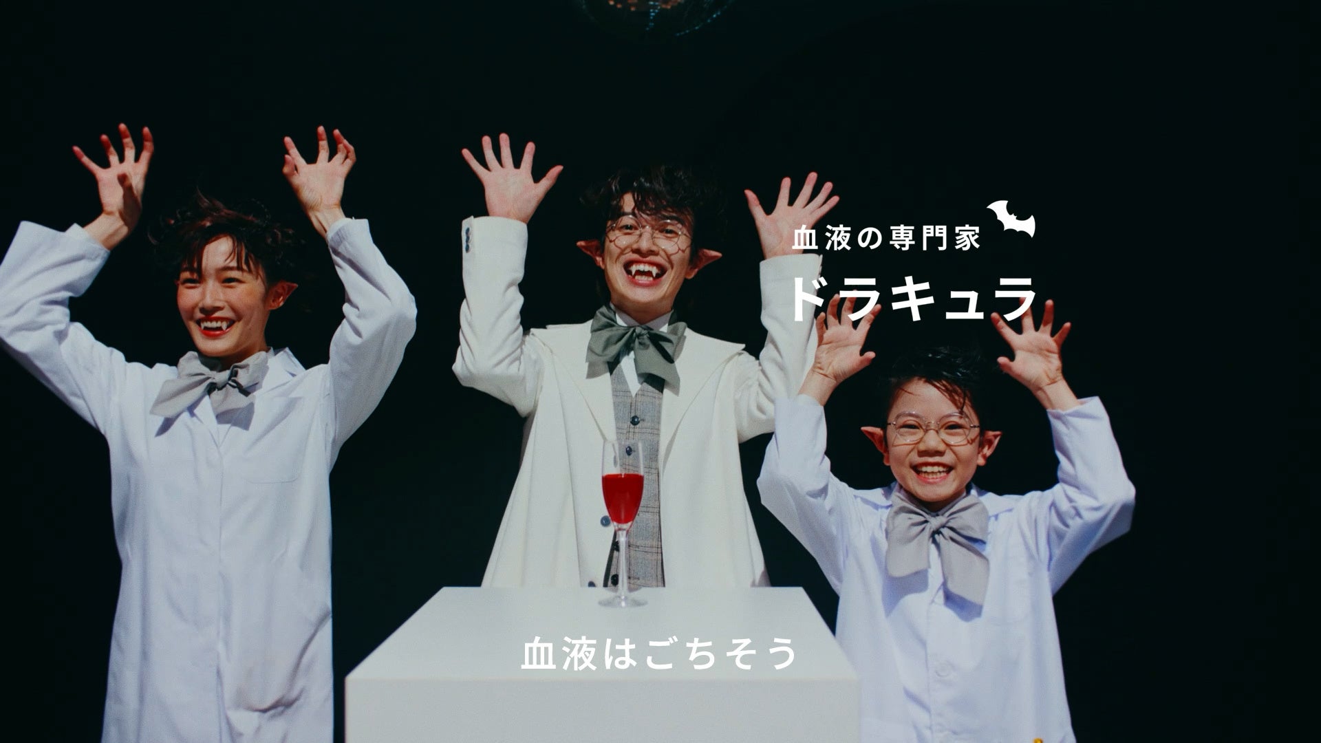 新作では、「血液はごちそう…じゃなくて、可能性」「血液は飲むもの…じゃなくて、調べるもの」といったユーモラスなフレーズを、ドラキュラさんたちがオリジナルソングに乗せて歌い、踊ります。