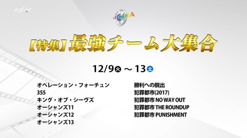 『オペレーション・フォーチュン』© 2023 MIRAMAX DISTRIBUTION SERVICES, LLC. ALL RIGHTS RESERVED. MOTION PICTURE ARTWORK © 2023 STX FINANCING, LLC. ALL RIGHTS RESERVED. 『355』© 2020 UNIVERSAL STUDIOS. © 355 Film Rights, LLC 2021 All rights reserved. 『キング・オブ・シーヴズ』© 2018 / STUDIOCANAL S.A.S. – All Rights reserved 『犯罪都市(2017)』© 2017 KIWI MEDIA GROUP & VANTAGE E&M. ALL RIGHTS RESERVED 『犯罪都市 THE ROUNDUP』© 2022 ABO Entertainment Co.,Ltd. & BIGPUNCH PICTURES & HONG FILM & B.A.ENTERTAINMENT CORPORATION, ALL RIGHTS RESERVED. 『犯罪都市 NO WAY OUT』© 2023 ABO Entertainment Co.,Ltd. & BIGPUNCH PICTURES & HONG FILM & B.A.ENTERTAINMENT CORPORATION, ALL RIGHTS RESERVED. 『犯罪都市 PUNISHMENT』© 2024 ABO Entertainment Co.,Ltd. & BIGPUNCH PICTURES & HONG FILM & B.A.ENTERTAINMENT CORPORATION, ALL RIGHTS RESERVED. 『オーシャンズ11』© 2001 Warner Bros. 『オーシャンズ12』© 2004 Warner Bros. Entertainment Inc. and Village Roadshow Films (BVI) Limited. All Rights Reserved. 『オーシャンズ13』© 2007 Warner Bros. Entertainment Inc. and Village Roadshow Films (BVI) Limited. All Rights Reserved. 『勝利への脱出』© MCMLXXXI by Paramount Pictures. All Rights reserved.