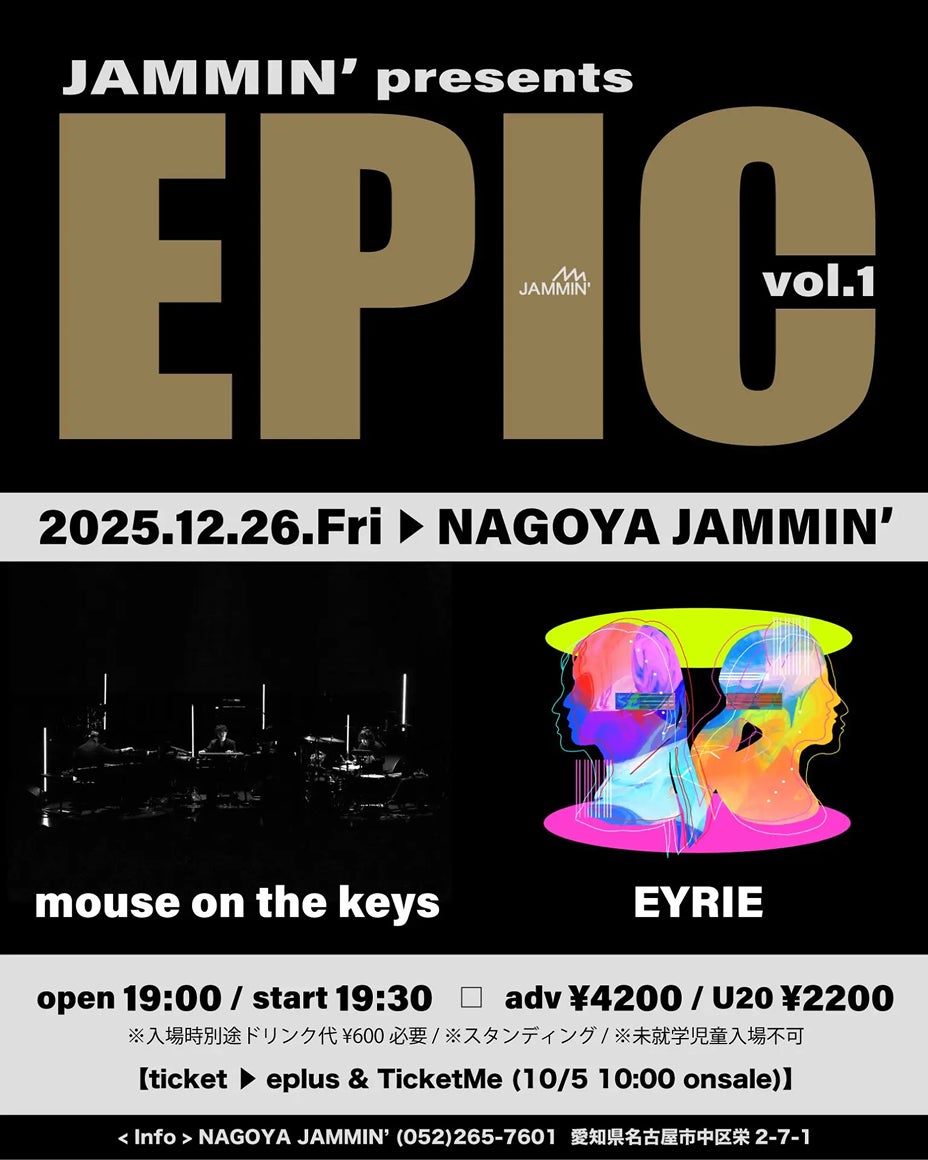 NAGOYA JAMMIN’が自信を持ってお届けする”神懸った”対バン企画「EPIC」記念すべき第一回目は国内外で活躍するmouse on the keysとEYRIEを迎えて開催。