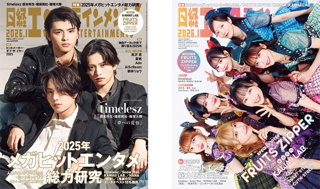 株式会社日経BP(本社:東京都港区、社長CEO:井口 哲也)は2025年12月4日、エンタテインメント総合メディア『日経エンタテインメント!』2026年1月号で、「2025年エンタメベスト10」などを発表しました。メイン記事は「2025年メガヒットエンタメ総力研究」で、「7大ジャンル年間ヒットランキング」「注目4ジャンルデータ分析2025」も含め総力49ページの大特集で、25年のエンタテインメントを振り返ります。