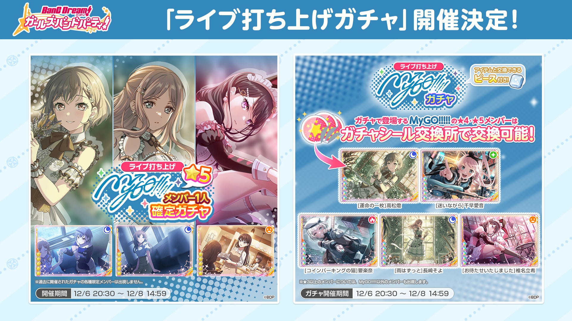 本ライブ開催を記念して、「ライブ打ち上げガチャ」が開催中です。MyGO!!!!!メンバーの出現率がアップするほか、様々なアイテムと交換できるピース付きとなります。