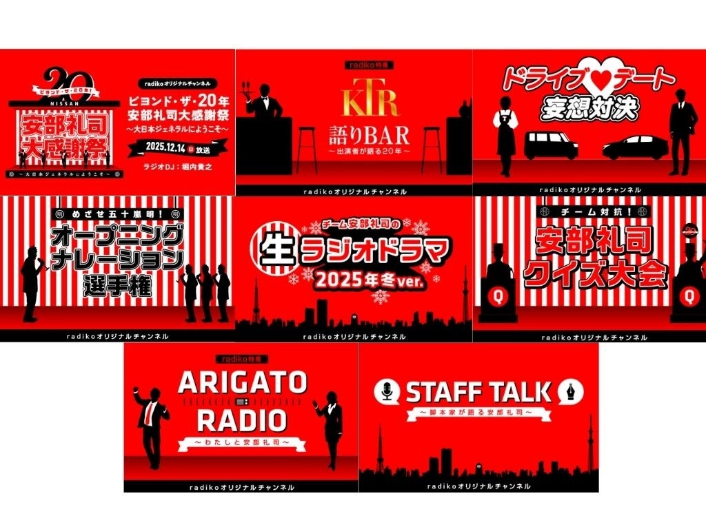 12月14日(日)に日産グローバル本社ギャラリーで開催される、番組20周年を記念したメモリアルイベント「ビヨンド・ザ・20年! 安部礼司大感謝祭~大日本ジェネラルにようこそ~」では、12月8日(月)よりradikoオリジナルチャンネルを開設。イベント当日は12:00から16:30まで生配信をおこないます(URL)(URLは12月8日(月)よりアクセス可能となります)。