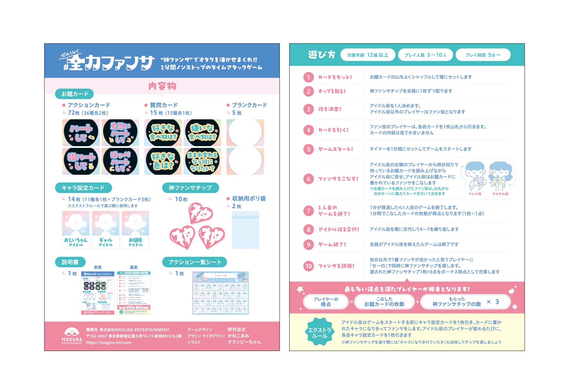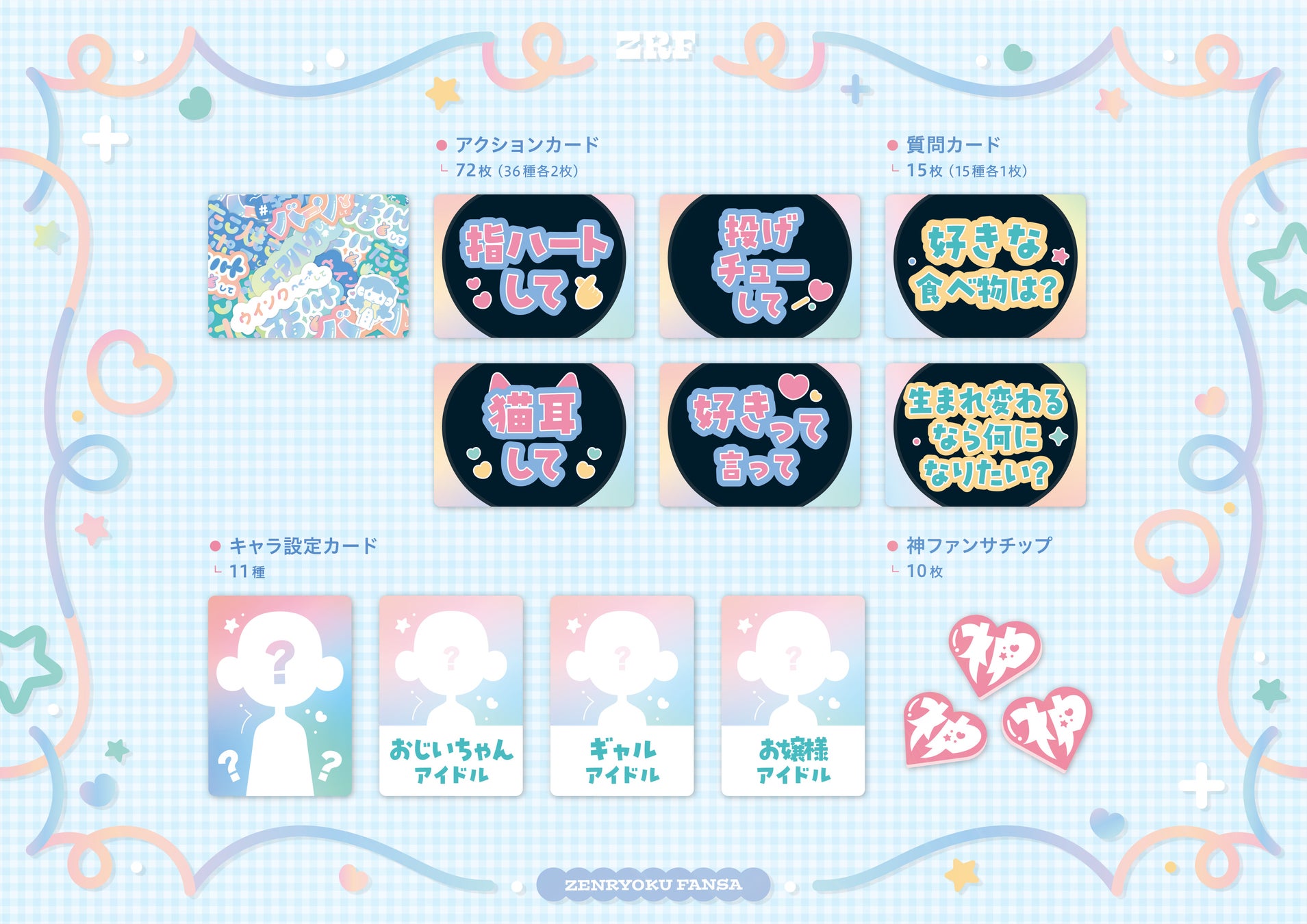 内容物:【お題カード】・アクションカード72枚(36種各2枚)・質問カード15枚(15種各1枚)・ブランクカード5枚、【アクション一覧シート】1枚、【キャラ設定カード】14枚(11種各1枚+ブランクカード3枚)、【神ファンサチップ】10枚(収納用ポリ袋2枚)、【説明書】1枚