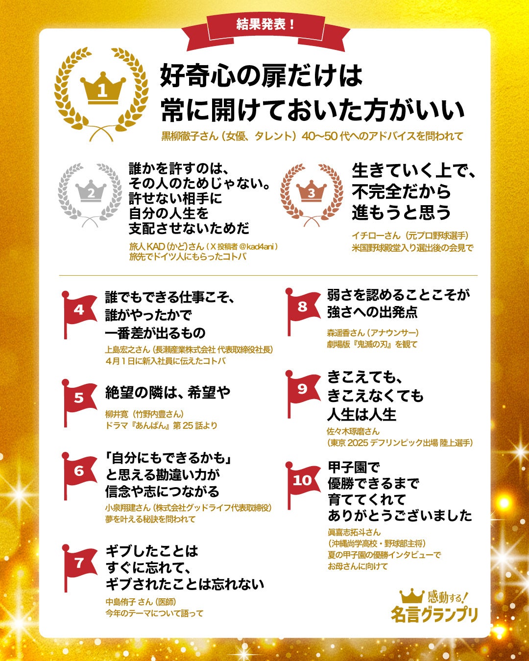 TV・SNS・雑誌などから年間300以上の名言を集める伝え方研究所※は「名言グランプリ2025」を開催しました。2017年以来、第9回目となる今年は、著名人ら計7名の審査を経て、「最も感動した名言No.1」を 「好奇心の扉だけは、常に開けておいた方がいい」に決定しました。このほか、ベスト10の結果を、伝え方研究所の公式webサイトなどで12月9日に発表しています。