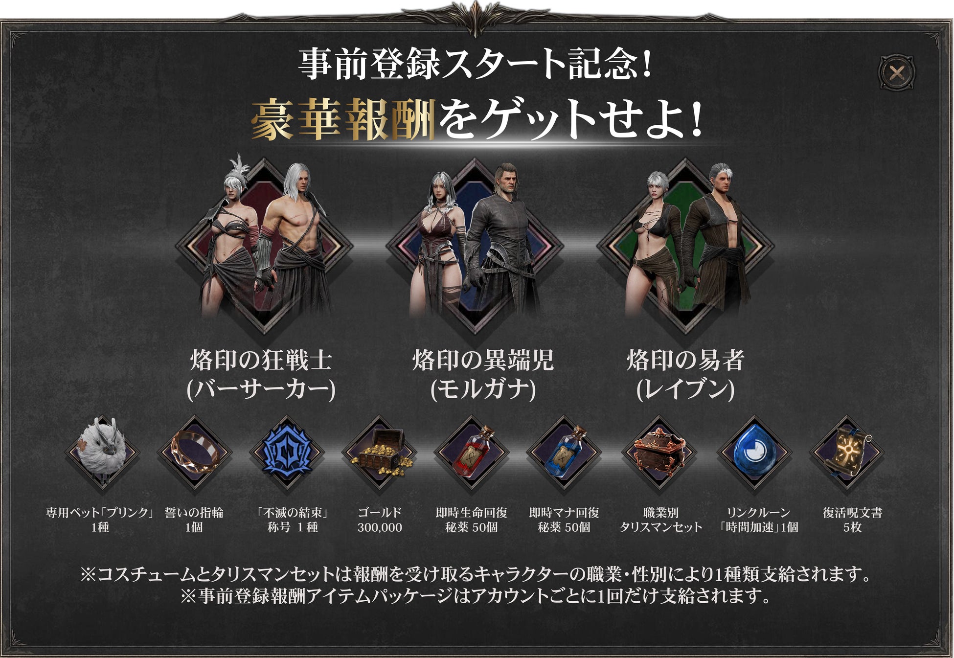 ※コスチュームおよびタリスマンセットは、受け取るキャラクターの 職業・性別 により内容が異なります。