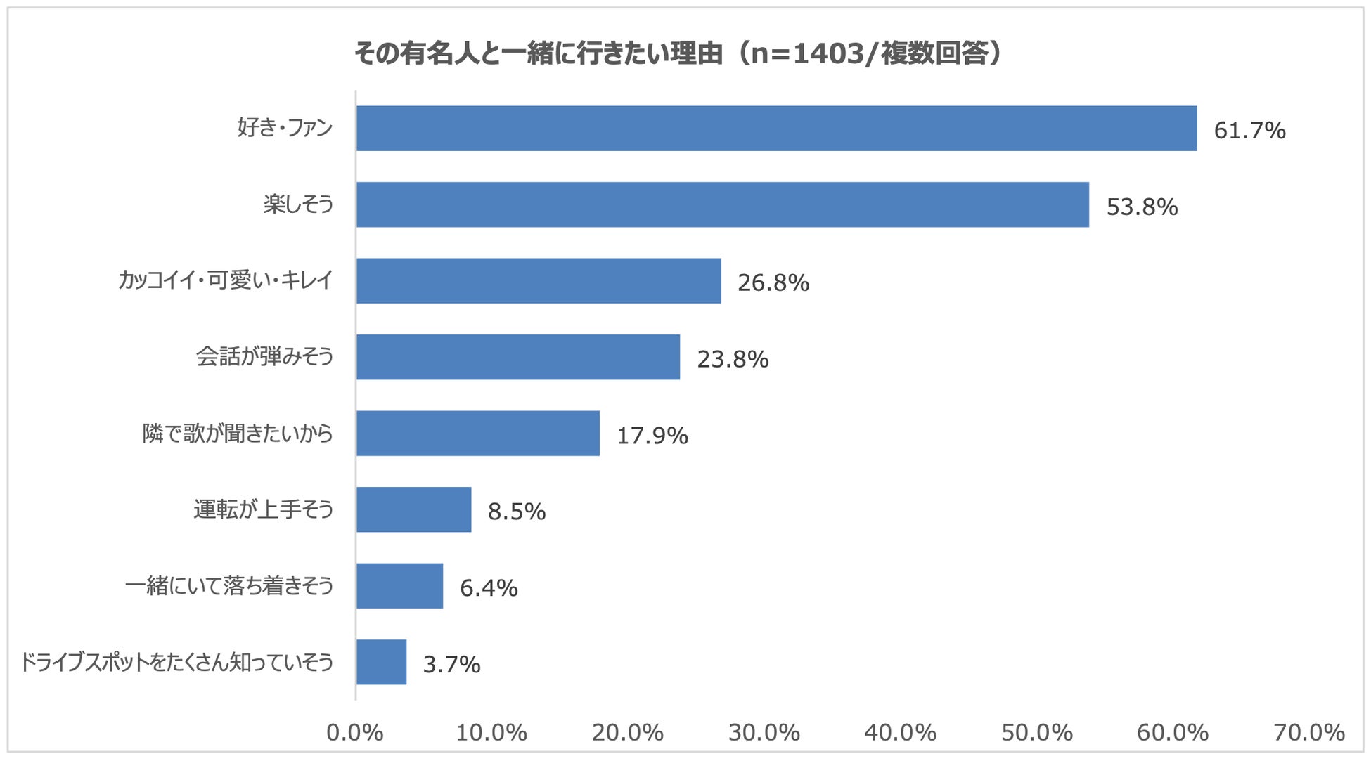 一緒にドライブに行きたい理由は、「好き・ファン」が最も多く61.7%、続いて「楽しそう」53.8%、「カッコイイ・可愛い・キレイ」26.8%の順でした。