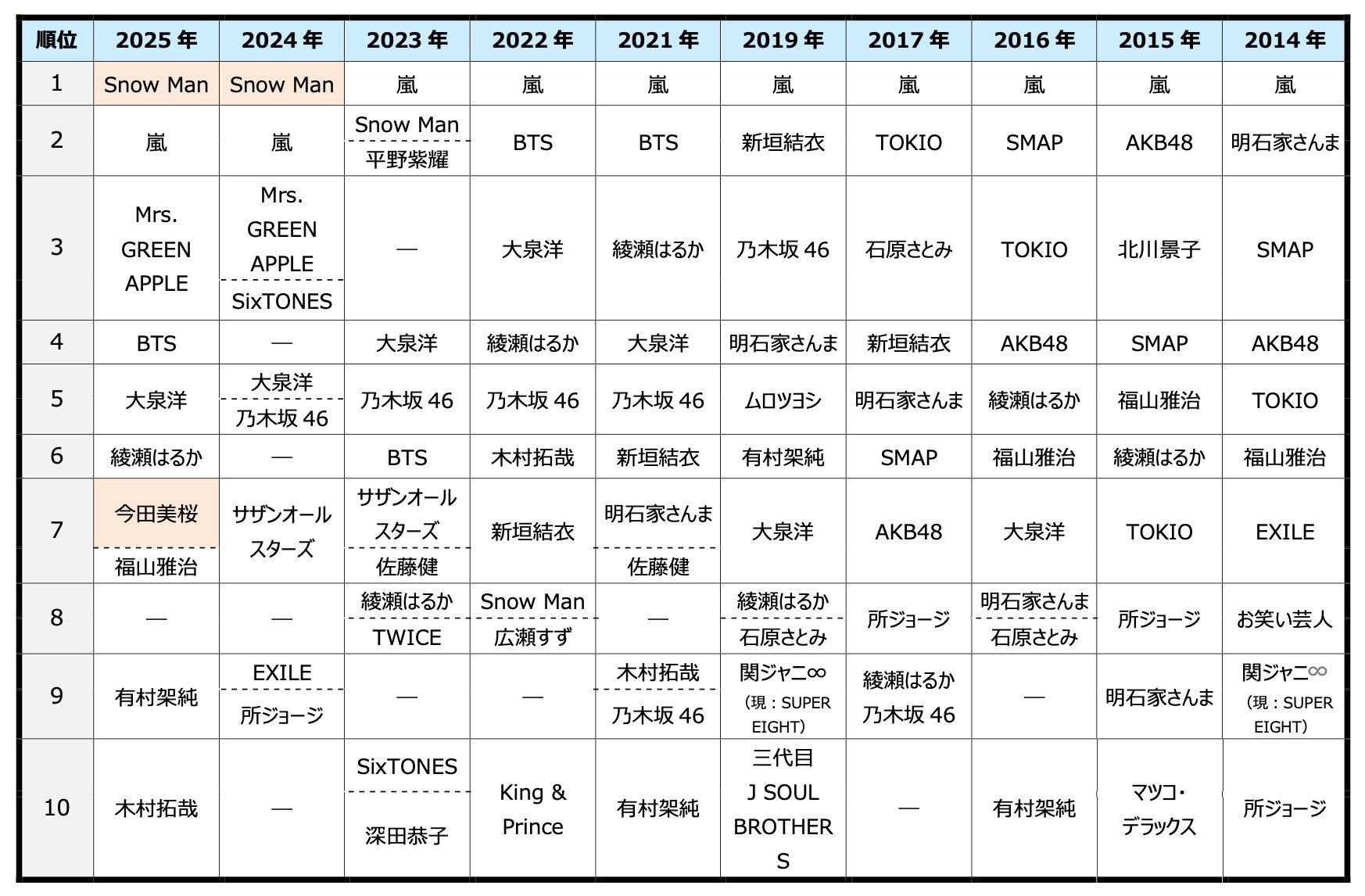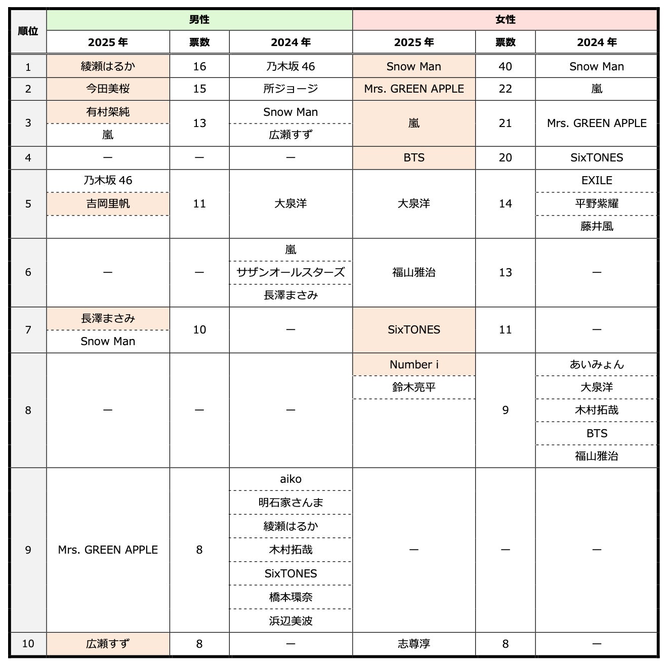 男性が選ぶ1位は「綾瀬はるか」、女性が選ぶ1位は「Snow Man」となりました。男性は昨年からTOP3が全て入れ替わり、女性俳優が多く票を集める結果となりました。女性は2年連続「Snow Man」が1位、「Mrs. GREEN APPLE」が順位を上げ2位となり、昨年に続き男性アーティストが多く票を集める結果となりました。