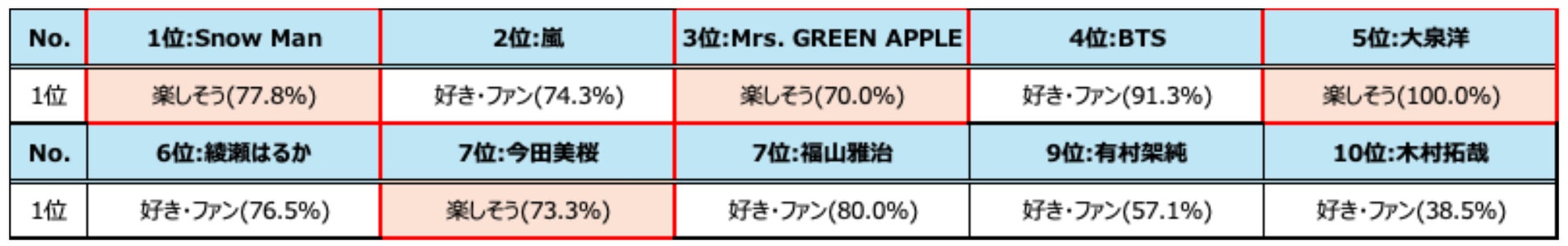 TOP10入りした有名人を選んだ理由は「好き・ファン」が最多ですが、「Snow Man」「Mrs. GREEN APPLE」「大泉洋」「今田美桜」は「楽しそう」が1位となり、中でも「大泉洋」を選んだ人は全員が「楽しそう」を理由にあげる結果となりました。