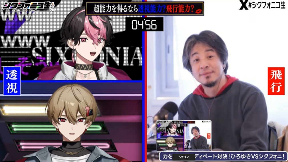 前半のコーナーは「先輩教えてください!ひろゆきさんにお悩み相談!!!」。シクフォニメンバー6人からそれぞれ、ひろゆきへ悩みを相談し、ひろゆきの広い知見からズバッと回答してもらいます。MCの鬼龍院がコーナーを進行しようとすると、ひろゆきから「鬼龍院さんMCやってるの新鮮な感じがしますね」と触れられると、鬼龍院は「音楽だけでは厳しいと最近気づき始めて…」と返し、視聴者からの笑いを誘いました。