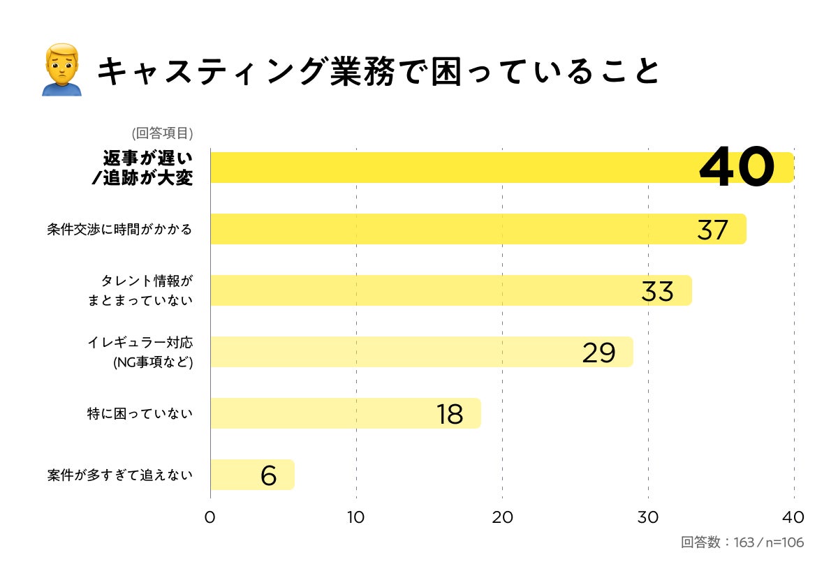 キャスティング業務においてもコミュニケーションコストの課題が上位を占めており、前述の「改善ニーズ(スピード・情報の見える化)」と関連していることがうかがえます。
