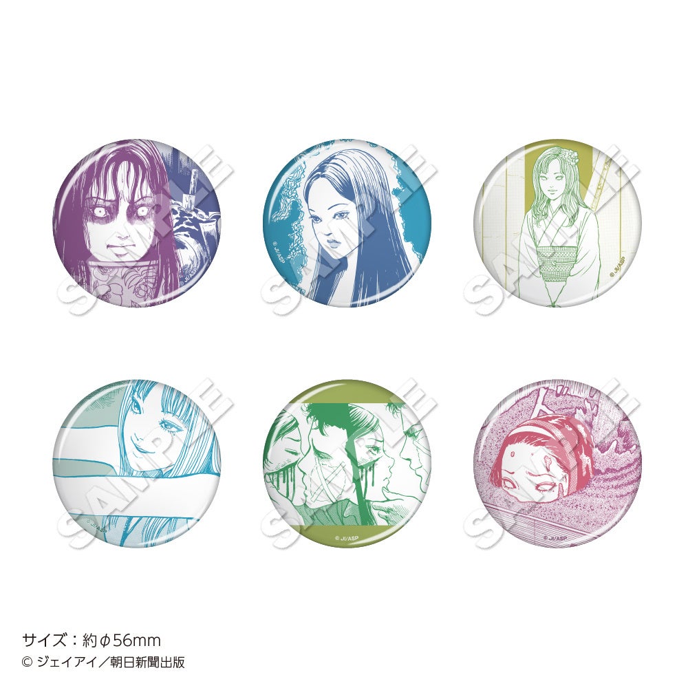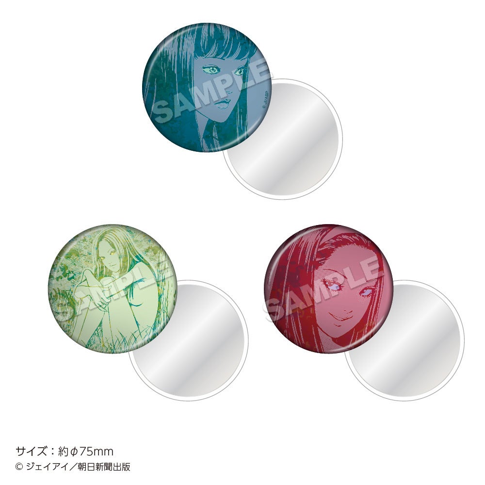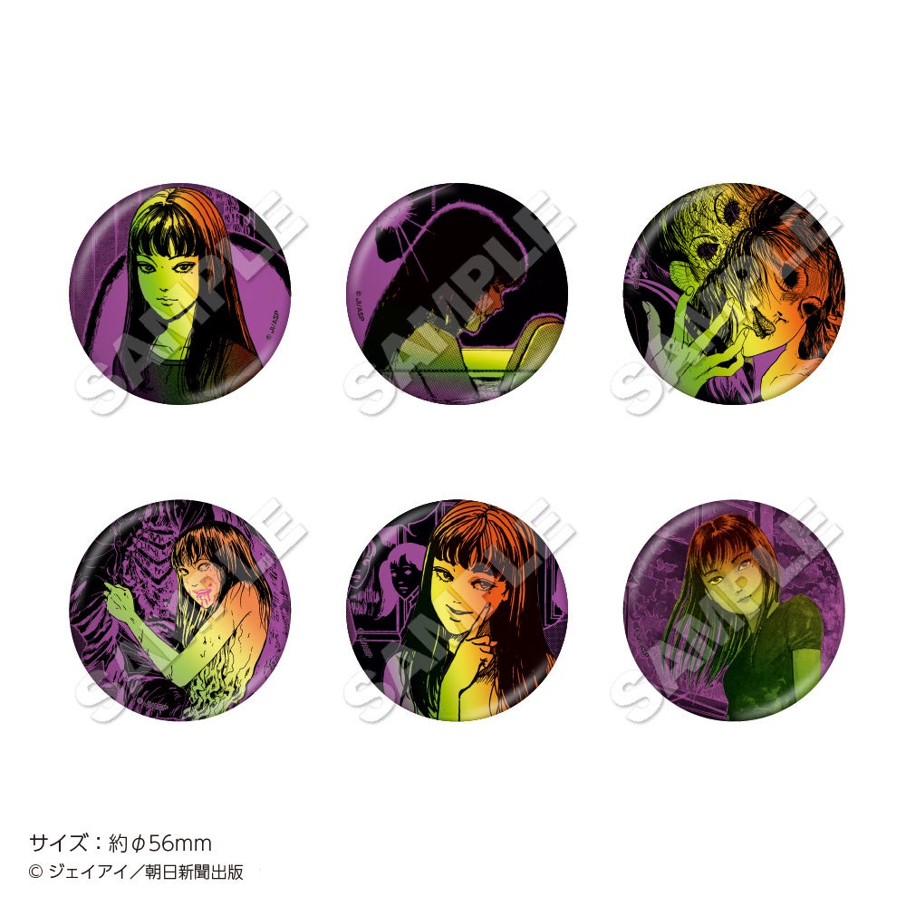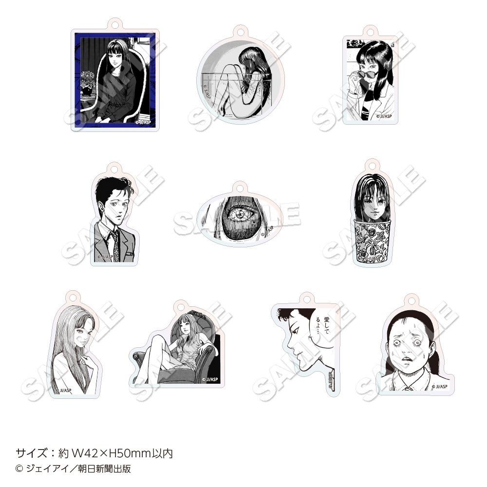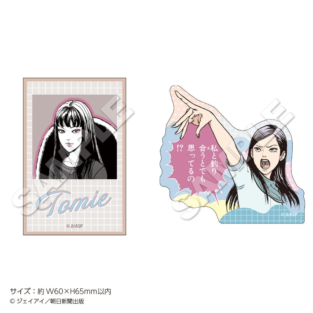 チケットホルダー、トレーディング缶バッジvol.1(全6種)・vol.2(全6種)、ラメアクリルアートボード、トレーディングポストカード(全10種)、ポストカードホルダー、缶ミラー(全3種)、三人の富江アクリルキーホルダー(全3種)、自ら増殖をはじめる富江巾着、自ら増殖をはじめる富江ブロックメモ、ステッカーセット(2枚入り)、クリアしおりセット、パネルガチャ(ミニアクリルチャーム全10種)