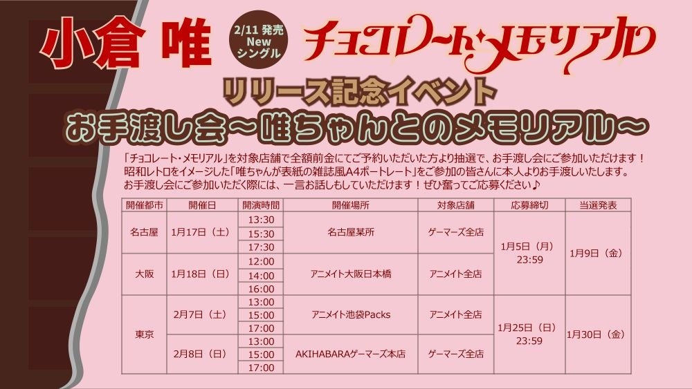 小倉 唯 Newシングル「チョコレート・メモリアル」の発売を記念して、リリースイベントの開催が決定しました!