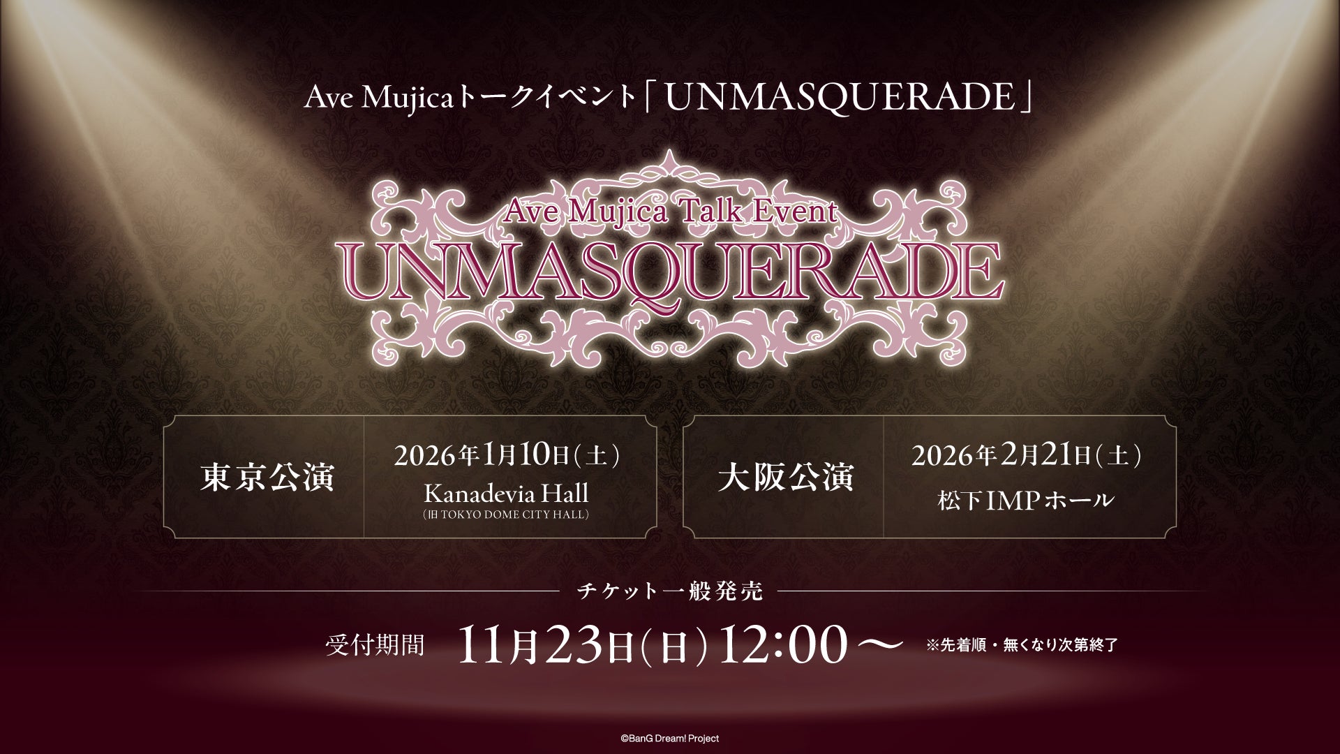2026年1月10日(土)にKanadevia Hall、2月21日(土)に松下IMPホールにて、Ave Mujica トークイベント「UNMASQUERADE」を開催します。現在、チケット一般発売が受付中です。