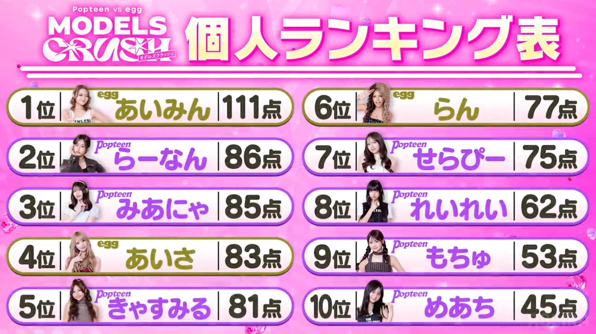 コラボ雑誌の“表紙&誌面争奪戦”では、各バトルで『Popteen』と『egg』それぞれのチームから5人の選抜メンバーを選んで対決。選抜された5人の個人得点を合算してチームポイントになり、最終的にポイントが多いチームが勝利となります。さらに、最終個人得点総合1位のモデルがコラボ雑誌の表紙を飾ることができる、モデルの夢とプライドをかけた真剣勝負となっています。