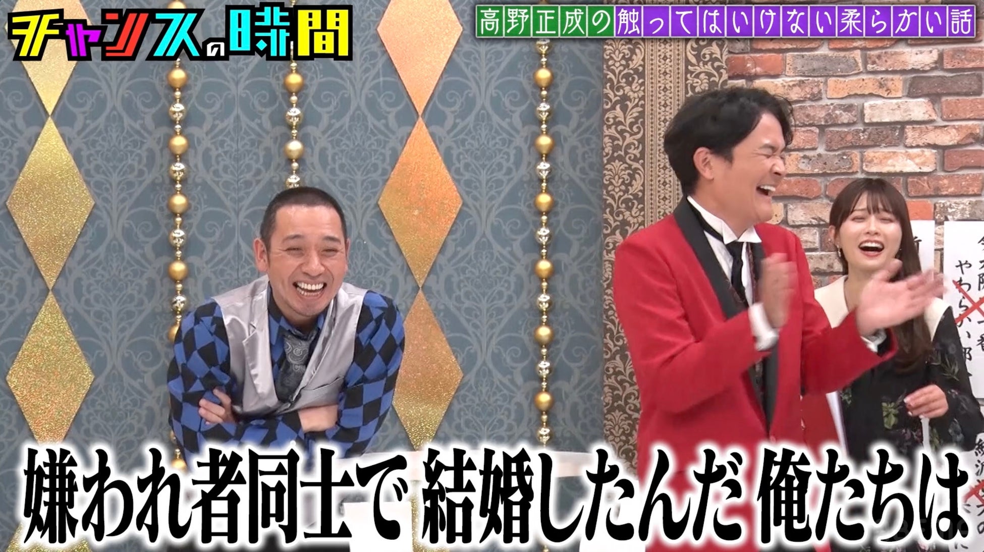 また、お見送り芸人しんいちが放った一言で、高野が涙目になって反論する場面も。“柔らかい話”の連発で感情を爆発させた高野に、お見送り芸人しんいちは「高野はこうやって怒っても、家に帰ったらキレイな奥さんがいるからいいよな」と茶々を入れます。瞬間的に「キレイじゃねぇよ、俺の奥さんは」と返した高野に、お見送り芸人しんいちは「ほんまにまるゆかのこと大好きで、褒めたのに…」と苦笑。高野は「そんな奴いねぇよ、俺しか」と静かなトーンで漏らすと、徐々に感情が昂っていき「嫌われ者同士で結婚したんだ、俺たちは」「誰からも愛されねぇ2人で結婚したんだ」と絶叫。見かねた芸人たちが「違うよ」「みんな2人とも大好き」とフォローしたものの、涙目になりながら「余りもので結婚したんだよ」と叫んだ高野にスタジオは笑いと悲哀に包まれました。