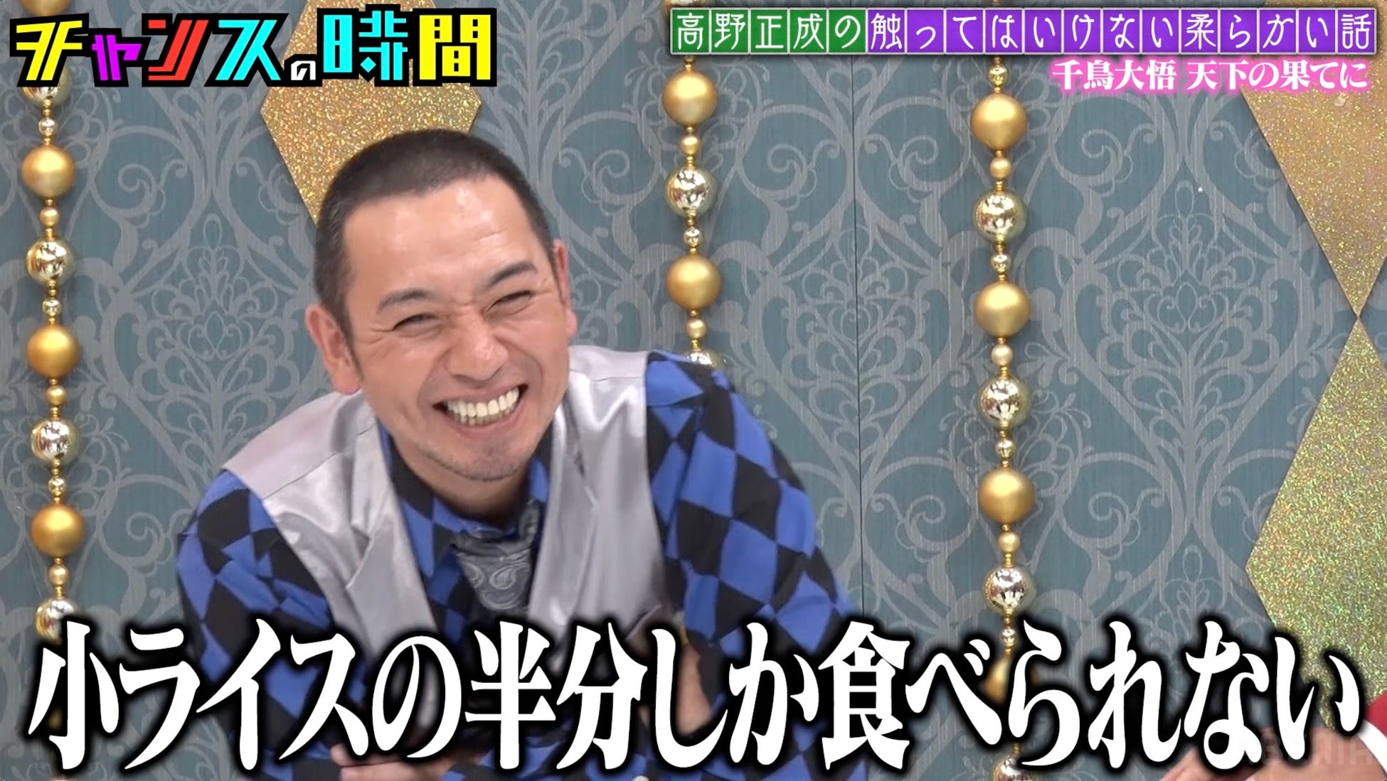 また、ちゃんぴおんず・大ちゃんは、プライベートでよく飲みに行っているという大悟のプライベートについて、「今の大悟さんの楽しみは日曜日の『すぽると!』終わりに、コンビニで缶チューハイとさつま揚げ買って、1人で飲みながら家で『北の国から』を観ること」と暴露。続けて、「大悟さんは小ライスの半分しか食べられない」「大ライスを頼むのが目標」とも明かして笑いを誘うと、「後輩としてこういう話もしていきたい」と語ります。ノブも「可愛げも出るし、いいんじゃない?」と肯定的な姿勢を見せますが、高野は「面白くねえよ、今の話は」「柔らかい柔らかくないじゃなくて面白くない」と一刀両断。「年齢的に普通だろ、食えなくなるのは」「大ライス食ってた方が気持ち悪い」と切り捨てました。