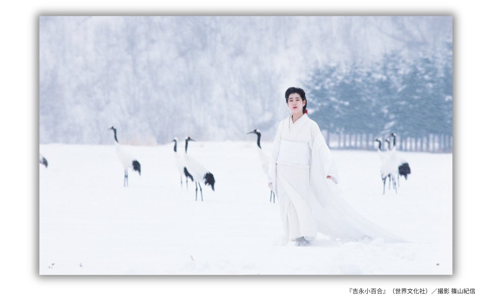 「つる」の写真があるのですが、あれには大変思い出があります。映画は新潟県の長岡で撮影したのですが、この写真は北海道の鶴居村という釧路の方で、映画の撮影が終わってから篠山さんと一緒に行き、川沿いのところや雪が降り続く中で撮影しました。遠くの方に鶴がいて、篠山さんと「あそこで撮ろうよ」ということになり、そーっと鶴の方に近づいて行ったんですね。そうしたら鶴が、逃げないんです。「仲間が来た」という風に待っていてくれて、そうしてあの写真を撮ることができたんです。本当に貴重な思い出になっています。 |