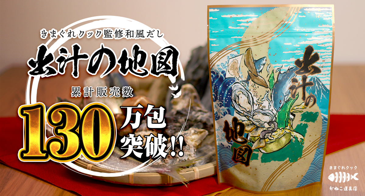 『出汁の地図』は2023年7月の発売以降、2024年6月に累計出荷数50万包を突破。その後も継続的に出荷を伸ばし、2025年12月時点で累計130万包に到達しました。現在は、きまぐれクックの公式ECサイトである「かねこ道具店」をはじめ、Amazon、楽天市場など、複数の販売チャネルで取り扱われています。