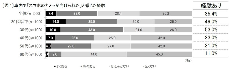 その結果、車内で「他人のスマホのカメラが自分に向けられているかもしれない」と感じた経験がある人は、全体の35.4%でした。また、20代以下は49.0%、30代は53.0%と約半数が「経験がある」と回答し、若い世代ほど他人のスマホのカメラレンズの向きに対する意識が高いことが分かりました[図1]。