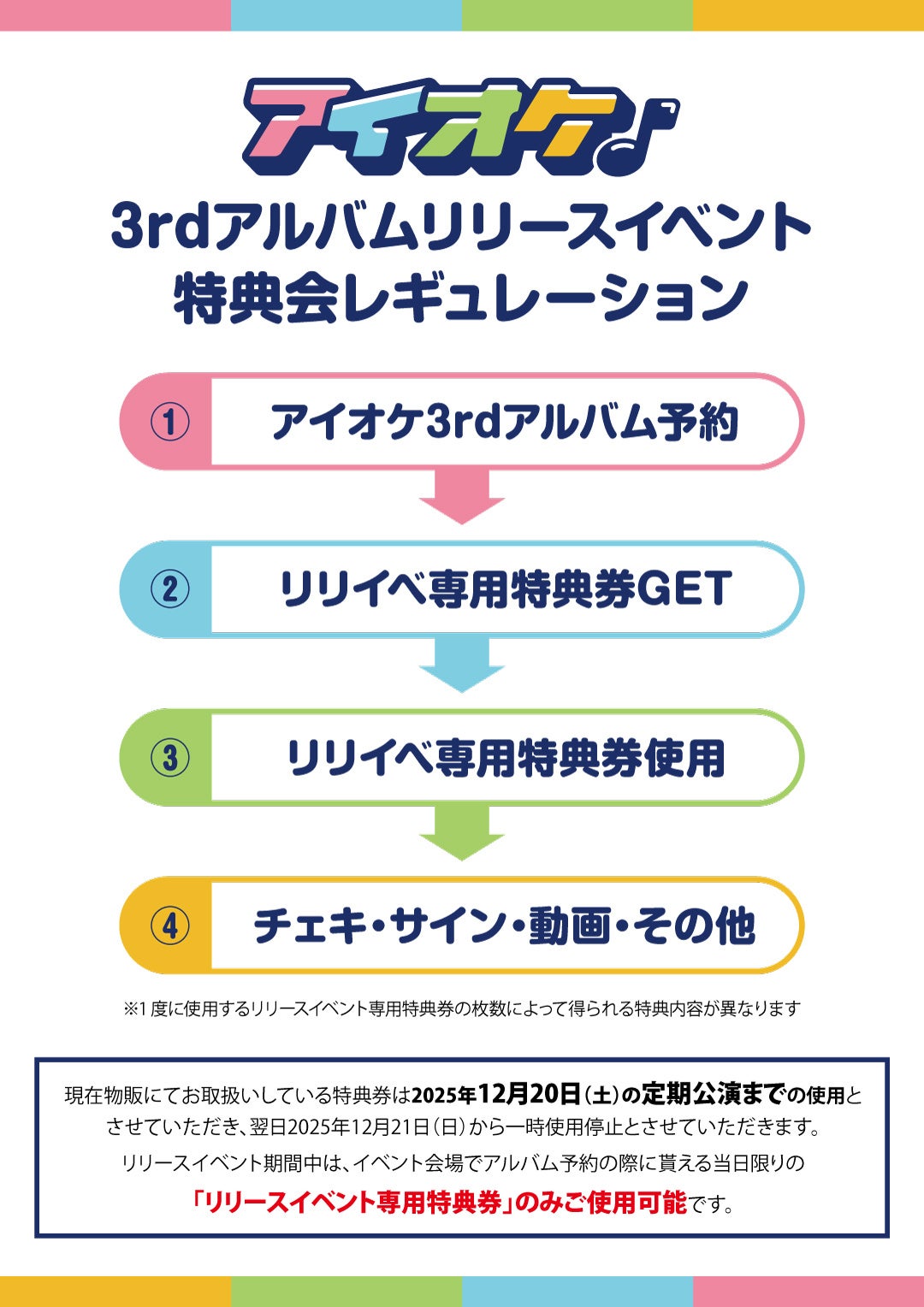 なお、リリースイベントの開催に伴い、現在使用している特典券は2025年12月20日(土)のアイオケ定期公演までとし、リリースイベント期間中はリリースイベント専用の特典券のみの使用に限定する。