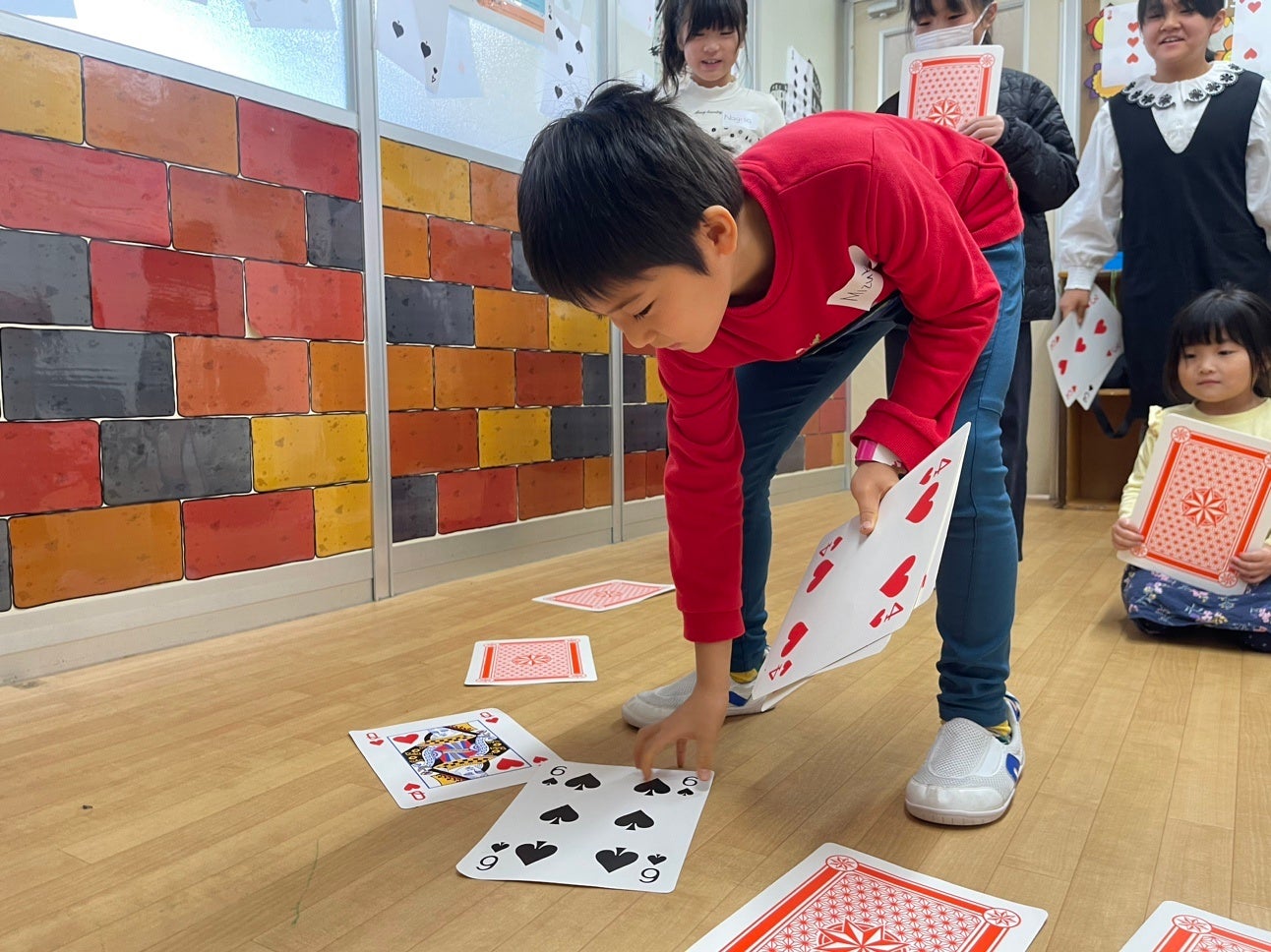 ゲームでは、大きなトランプで、ババ抜きや神経衰弱などの定番ゲームを楽しみました。グループのお友だちと協力しながら、”Next!” などと英語でやり取りする姿が印象的でした。