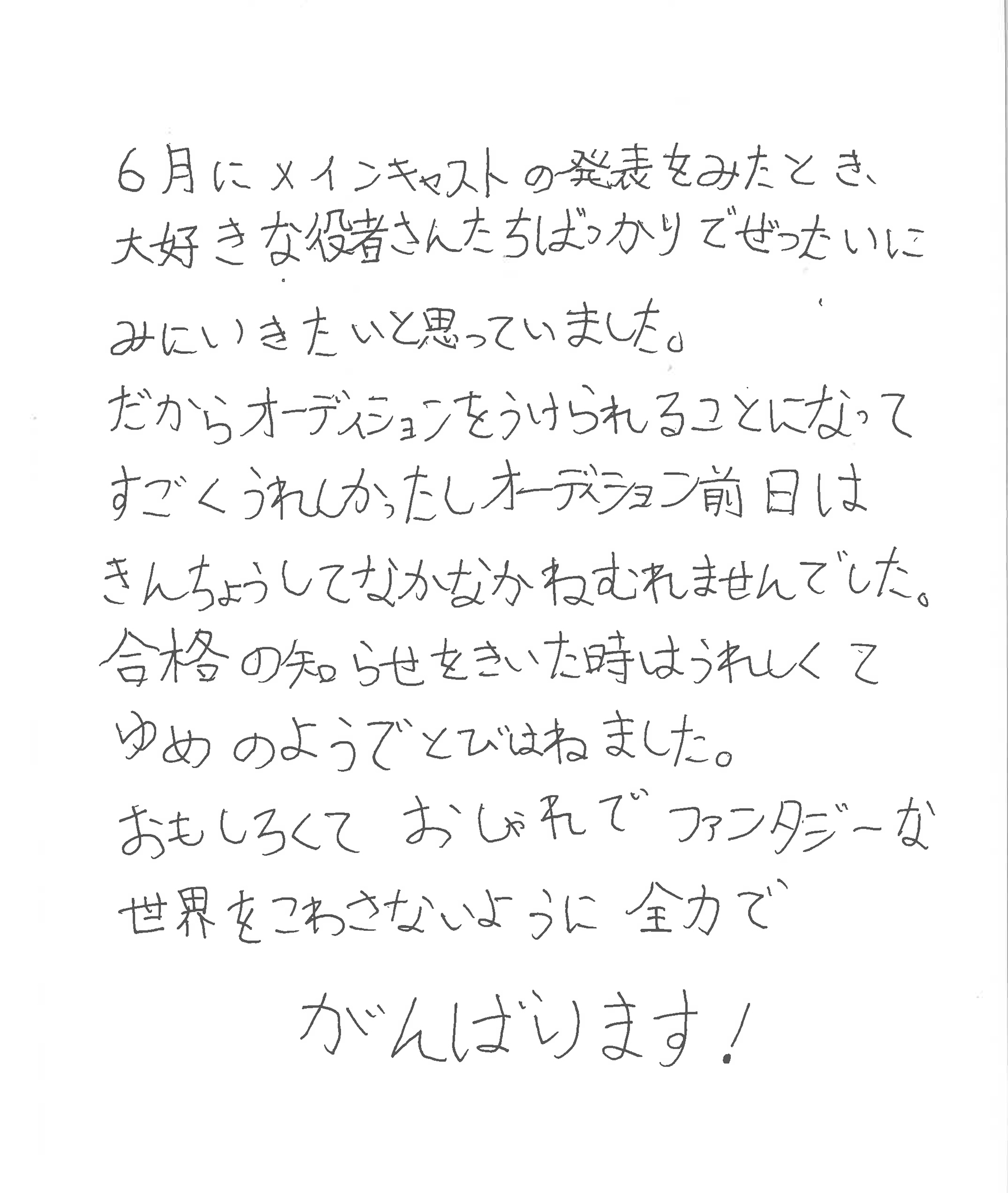 だからオーディションをうけられることになってすごくうれしかったしオーデション前日はきんちょうしてなかなかねむれませんでした。