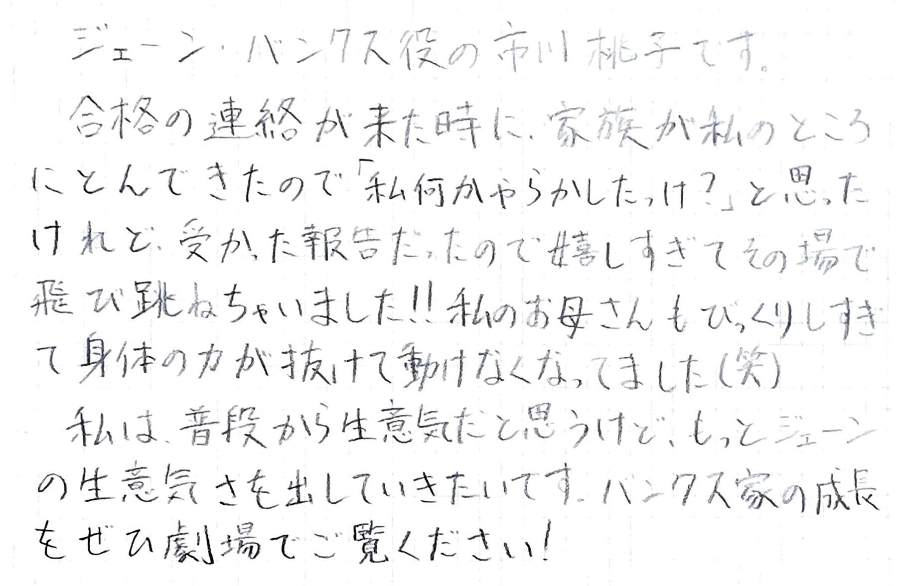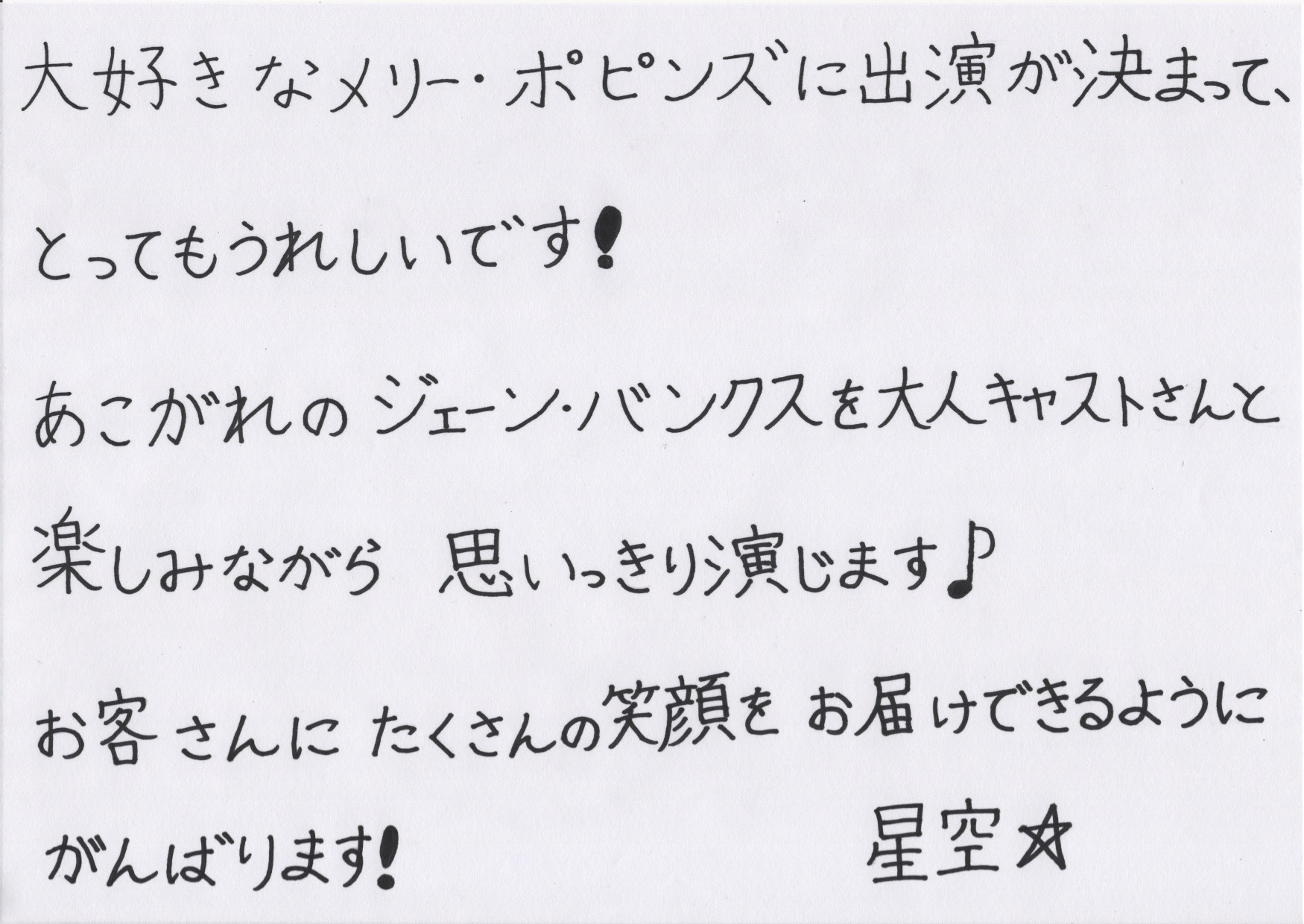 まず一つ目は、ジェーン・バンクスという役の気持ちや大切さを、ちゃんと心で感じながら演じることです。ジェーンとして舞台に立つのは少しドキドキするけれど、「がんばるんだ!」という勇気をつかんで、最後までやりとげたいです。