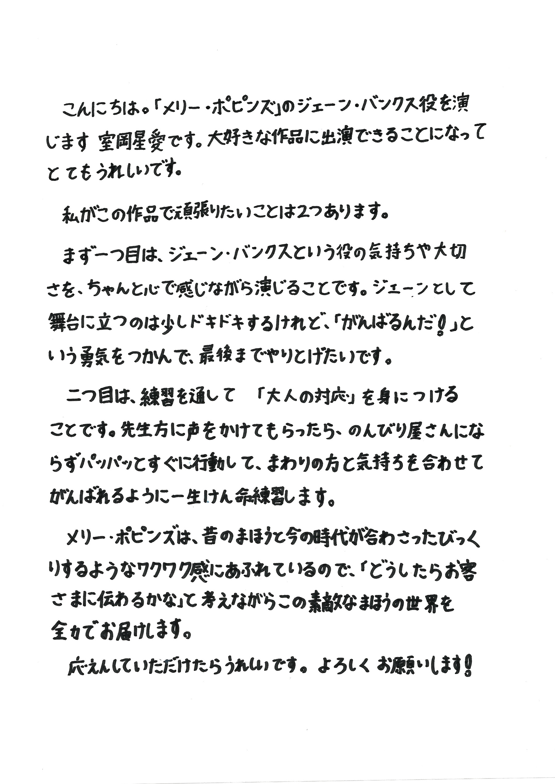 こんにちは。『メリー・ポピンズ』のジェーン・バンクス役を演じます室岡星愛です。大好きな作品に出演できることになってとてもうれしいです。