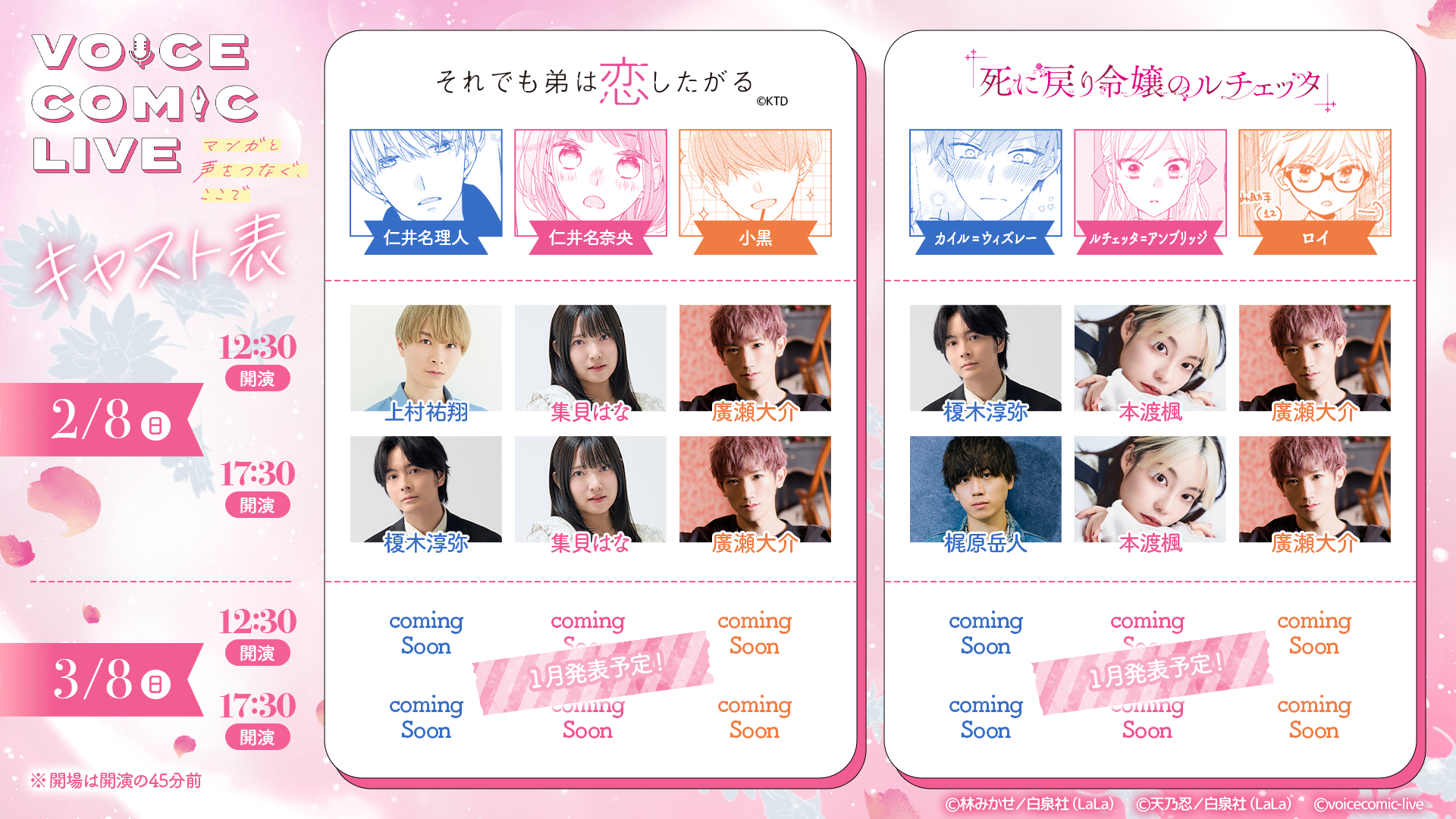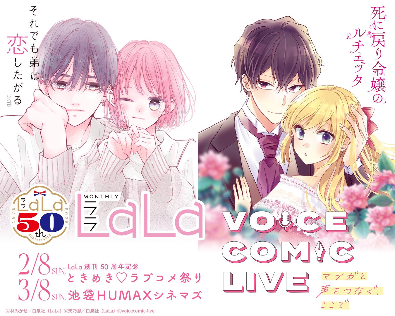 株式会社ヒューマックスエンタテインメント(東京都新宿区、代表取締役社長:秋元巳智雄)が、池袋HUMAXシネマズにて開催する『ボイスコミックライブ』の2026年2月8日(日)の出演者が決定しました。本公演は白泉社のLaLa創刊50周年記念公演として「ときめき♡ラブコメ祭り」と題して開催します。『ボイスコミックライブ』は、スクリーンに映るマンガのキャラクターに、声優がライブで声を吹き込むステージイベントです。生の演技だからこそ味わえる緊張感と臨場感が、観客の皆様を物語の世界へエスコートいたします。