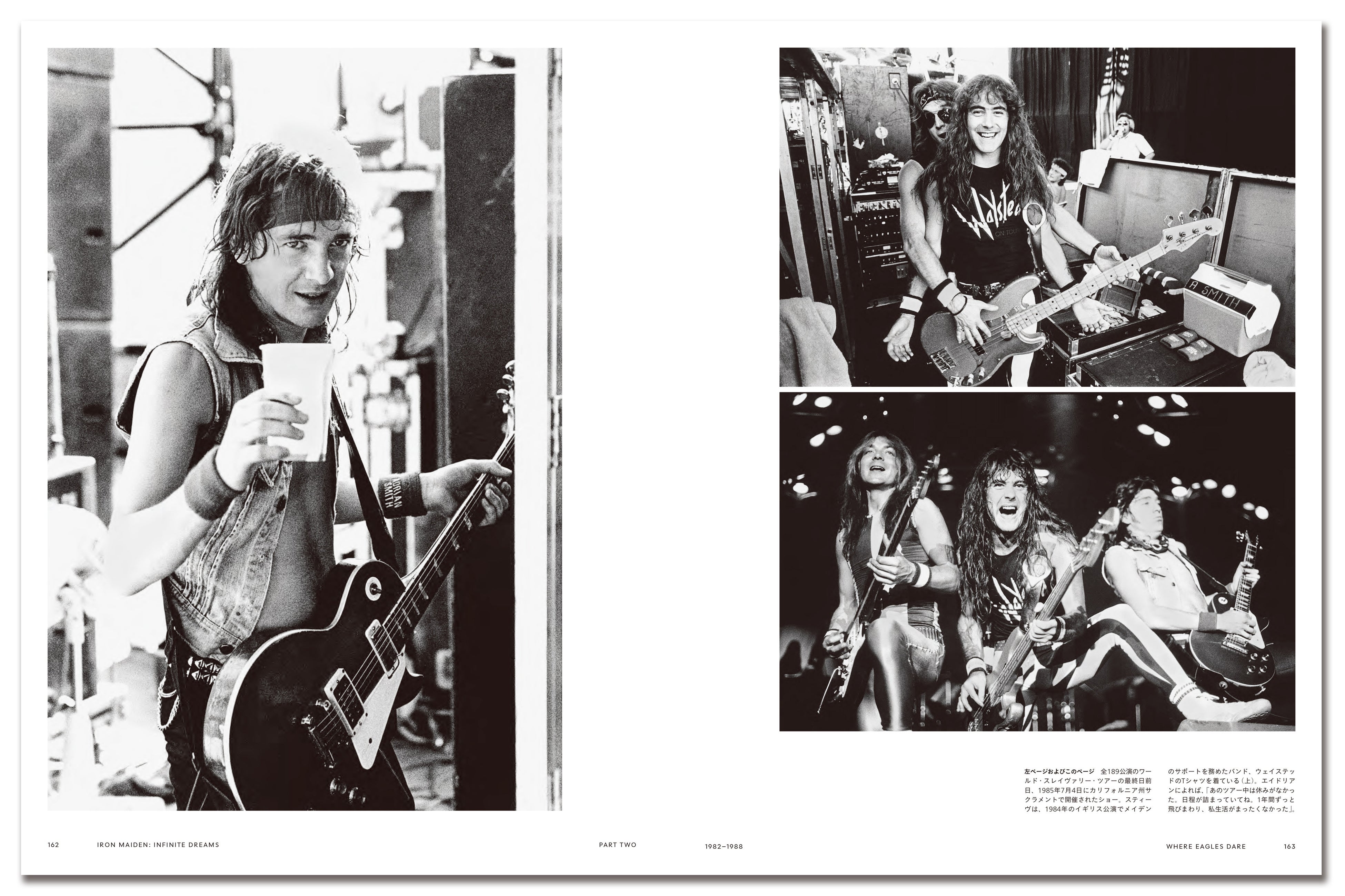 本書『アイアン・メイデン オフィシャル・ビジュアル・ヒストリー』には、初来日時に新宿西口の街頭で撮影したレアショット、1987年5月「サムホエア・オン・ツアー」での来日時に撮影した大阪道頓堀での写真(後にドキュメンタリ—『12 Wasted Tears』ジャケットに使用)、スティーヴとデイヴ・マーレイが日本への思いを語った『Maiden Japan』レビューなどなど、50年にわたるバンドのキャリアと日本との密接な関係、アイアン・メイデンが日本によせる激しく燃え続ける鋼鉄魂が随所に刻み込まれています。