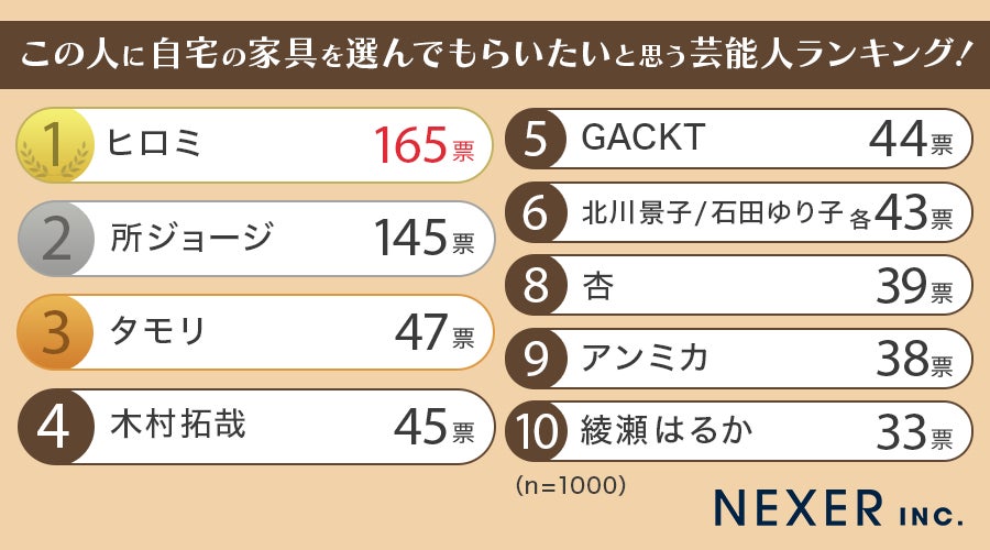 センスの良さや実用性を重視した家具選びをしてくれそうな芸能人が多く支持される結果となりました。