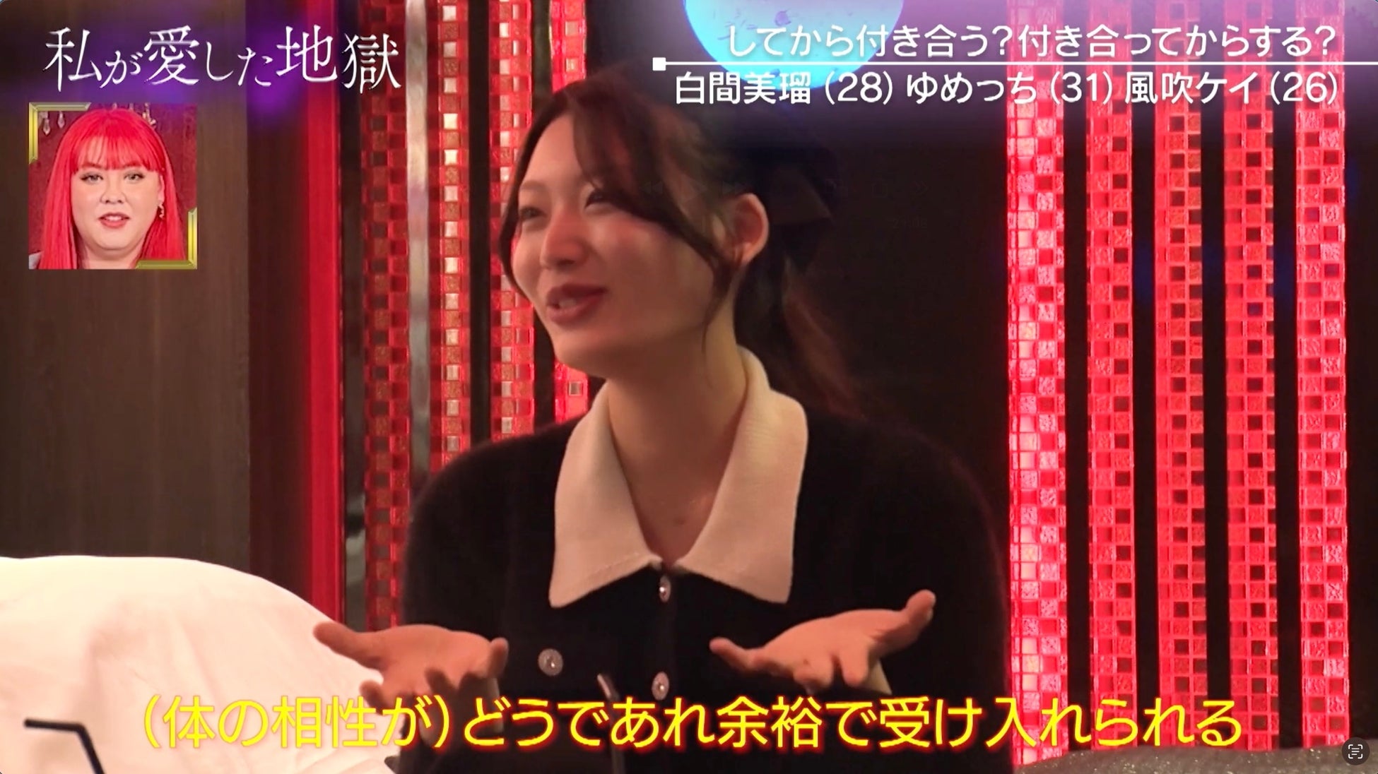理想の男性のタイプを語る場面では、「ムキムキで、背中が大きくて、毛が好き」と明かした白間に、ゆめっちが「一緒!」と大共感。「ヒゲも好きやし、腕毛好き、どこの毛も好き」としたものの「でも…下は嫌や」とまで語った白間に、風吹が「大矛盾やん」「人間的に守らなあかんとこやから生えてる」とツッコミを入れました。