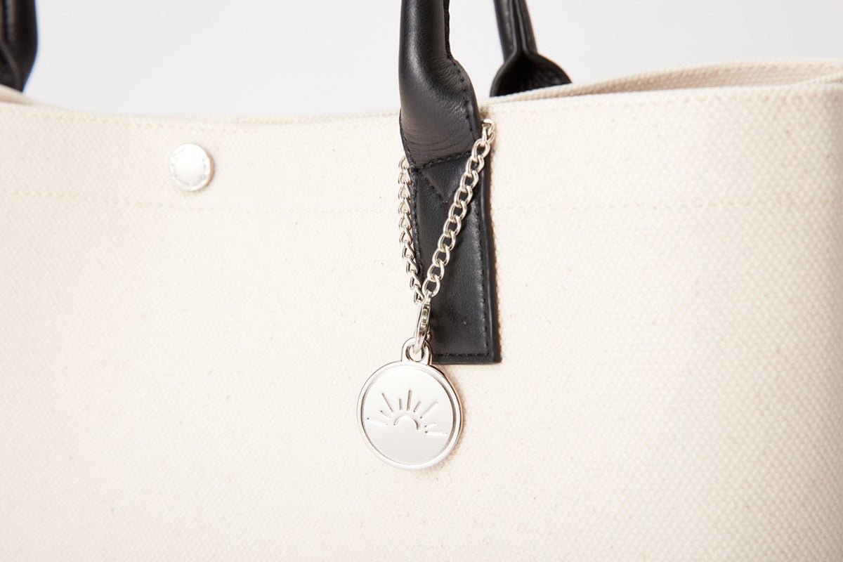トートバッグには番組ロゴのチャーム、ミニショルダーには型押しの番組ロゴが付いています。