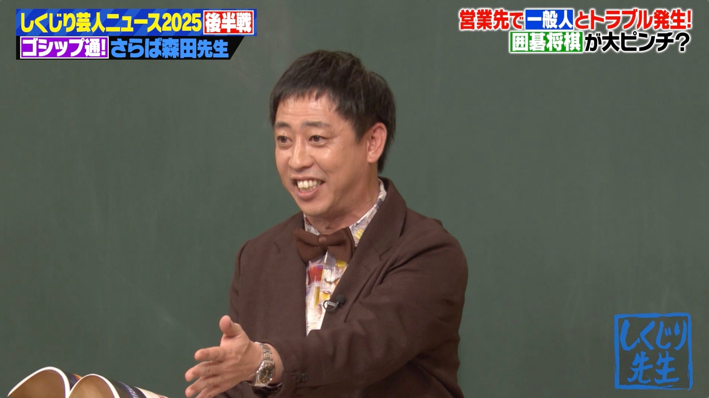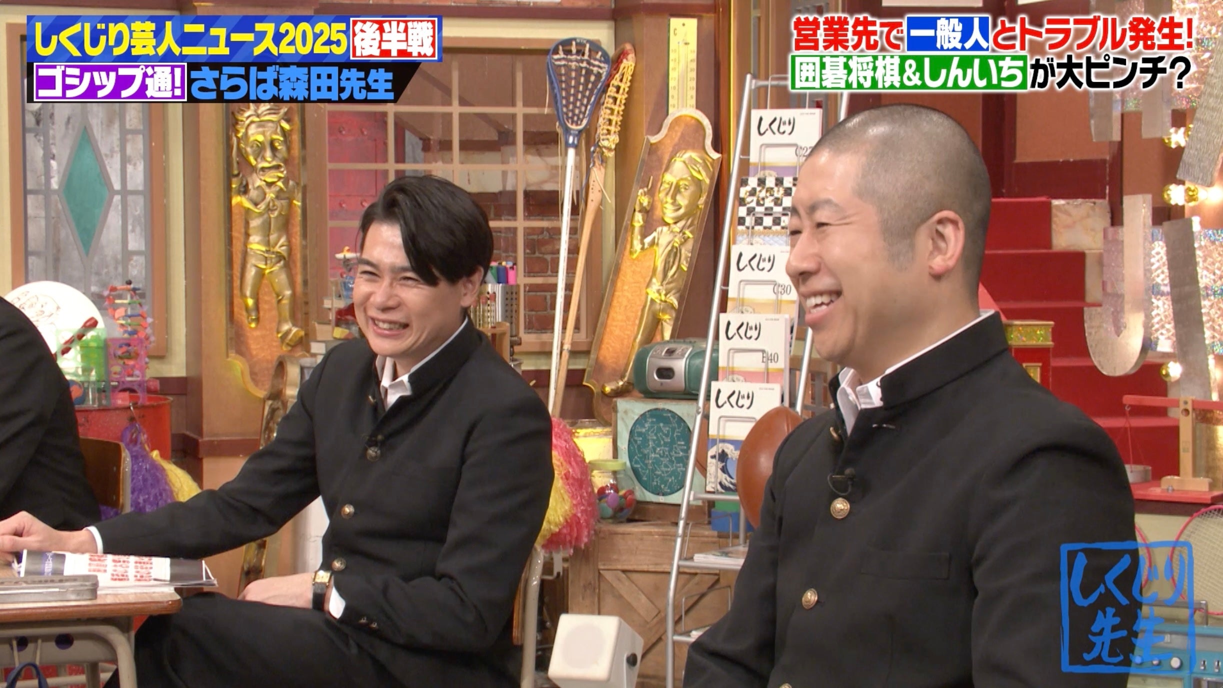 「囲碁将棋が横浜のお祭り営業で地元の若者と揉める」というニュースを紹介した森田先生は、「今年、横浜市内で行われた夏祭りの営業に囲碁将棋とお見送り芸人しんいちの2組が出演した」と経緯を説明したうえで、「囲碁将棋の“なぞなぞネタ”の途中で、しんいちが登場したことに最前列の若者が激怒」「『なぞなぞを続けろ』と囲碁将棋・根建と揉めた」と現場の混乱を明かしました。生徒役で出演したピン芸人・お見送り芸人しんいちが当事者として補足する形で、「屋外営業で持ち時間20〜30分ってキツいから。『乱入しましょうか?』『しんいち助かるよ』っていうのがあった」と当時のやりとりを明かします。その後、“なぞなぞネタ”の3問目で舞台に乱入したと説明。「そしたら最前列の子が『しんいち下がれ!』『4問目!』って叫んだ」「(若者は)ネタで笑ってないんですよ。『クイズを出せ』『なぞなぞ出してくれ』って言った」と明かし、まさかの理由に教室には笑いが広がりました。お見送り芸人しんいちは「めちゃくちゃ変な空気になりました」「警備員さんも3人くらい出てきた」と当日の異様な雰囲気を振り返り、「3人でしゅんとして帰った。来年呼ばれるかわからない」と語りました。