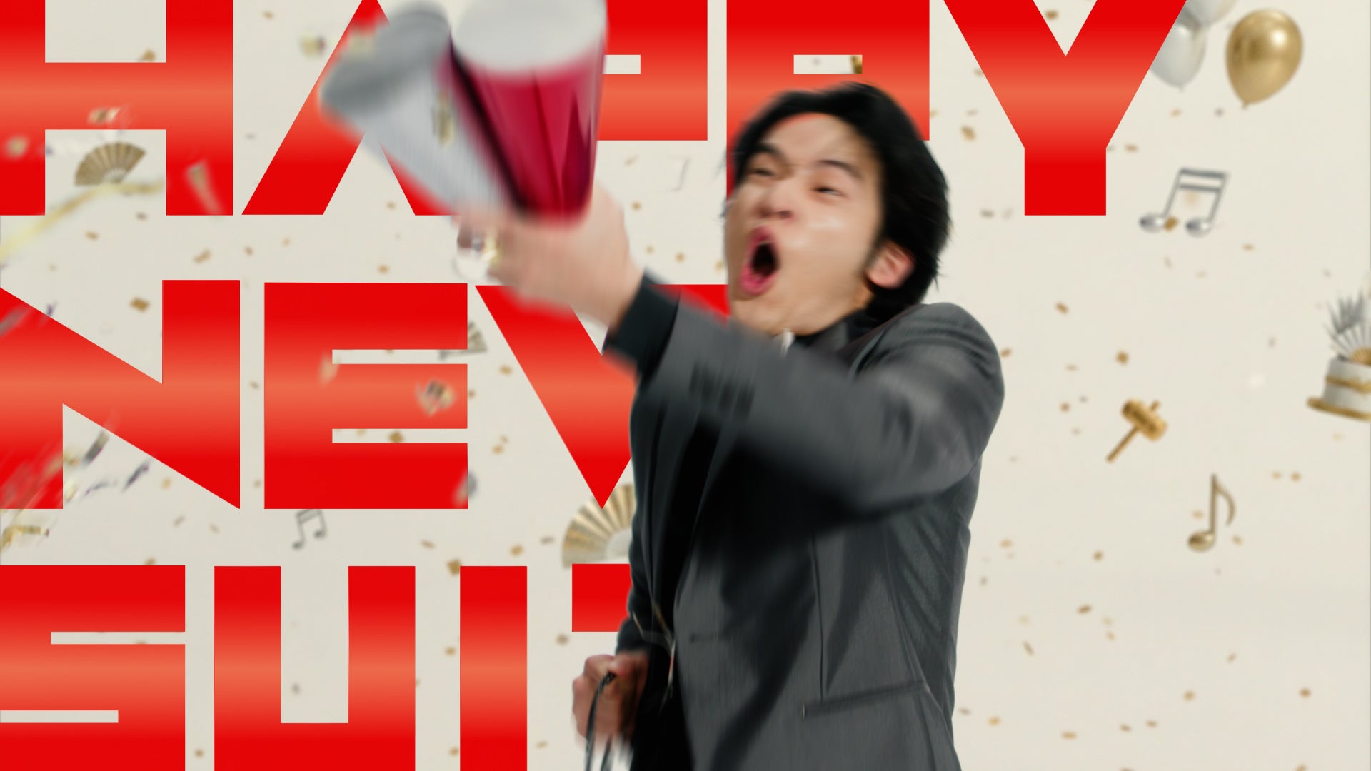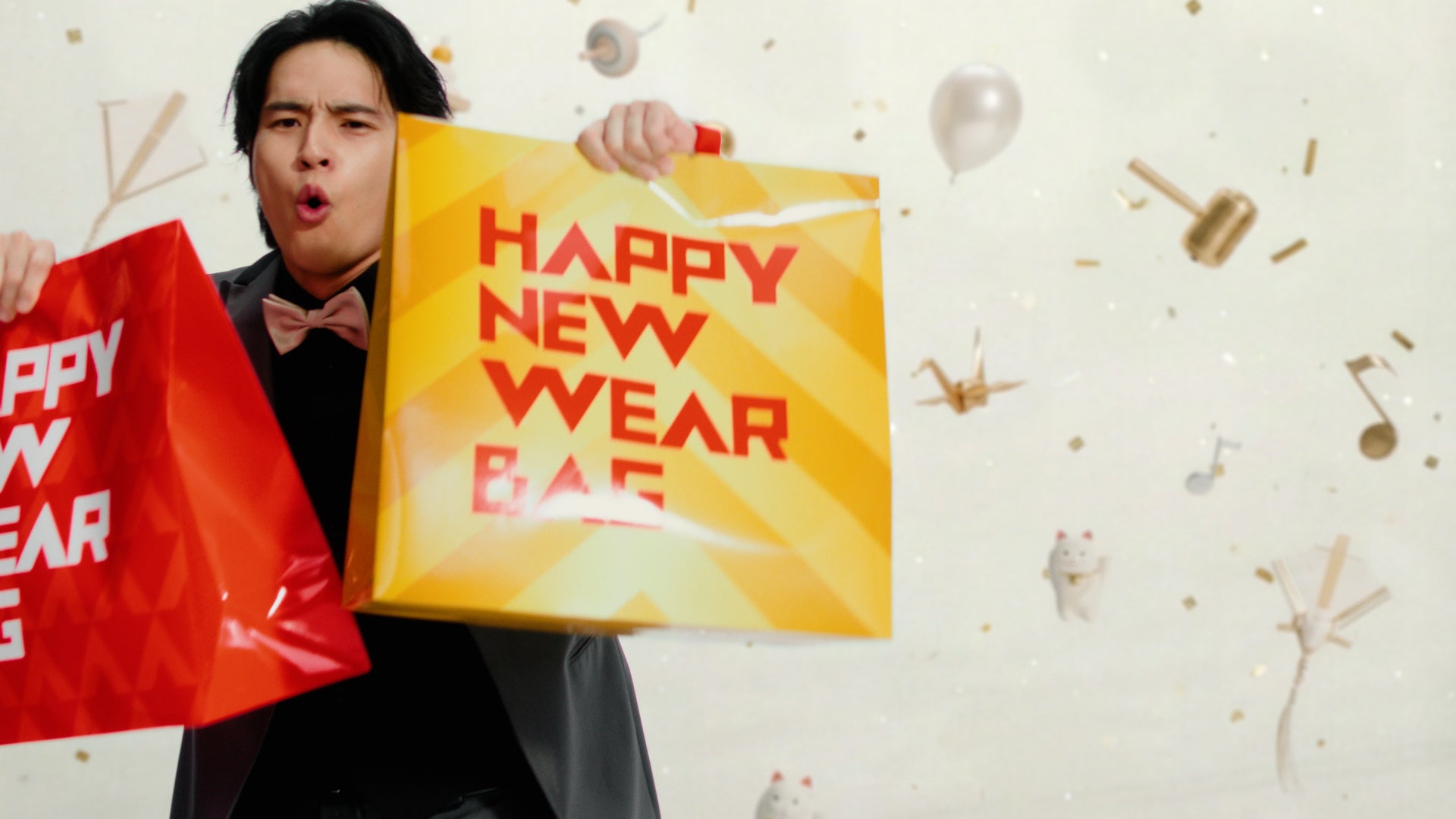 本CMは、橋本さんが赤いパーティードレス、生見さんは白いパーティードレスを着用し、お正月らしい「紅白」の色味を表現。また三浦さんと水上さんは、タキシードを着用し、フォーマルな装いで登場します。4名が声をそろえて「HAPPY NEW WEAR」「HAPPY NEW SUIT」でお祝い。三浦さんと橋本さんがシャンパンで乾杯するシーンや、水上さんと生見さんによる餅つきをイメージした、思わずクスッとする動きを見せるシーンなど、見ているだけで笑顔になれる構成に仕上がりました。なお初売りセールとして店内の特設コーナーでは、スーツ・フォーマルを半額で取りそろえる他、人気ブランドの福袋もご用意します。