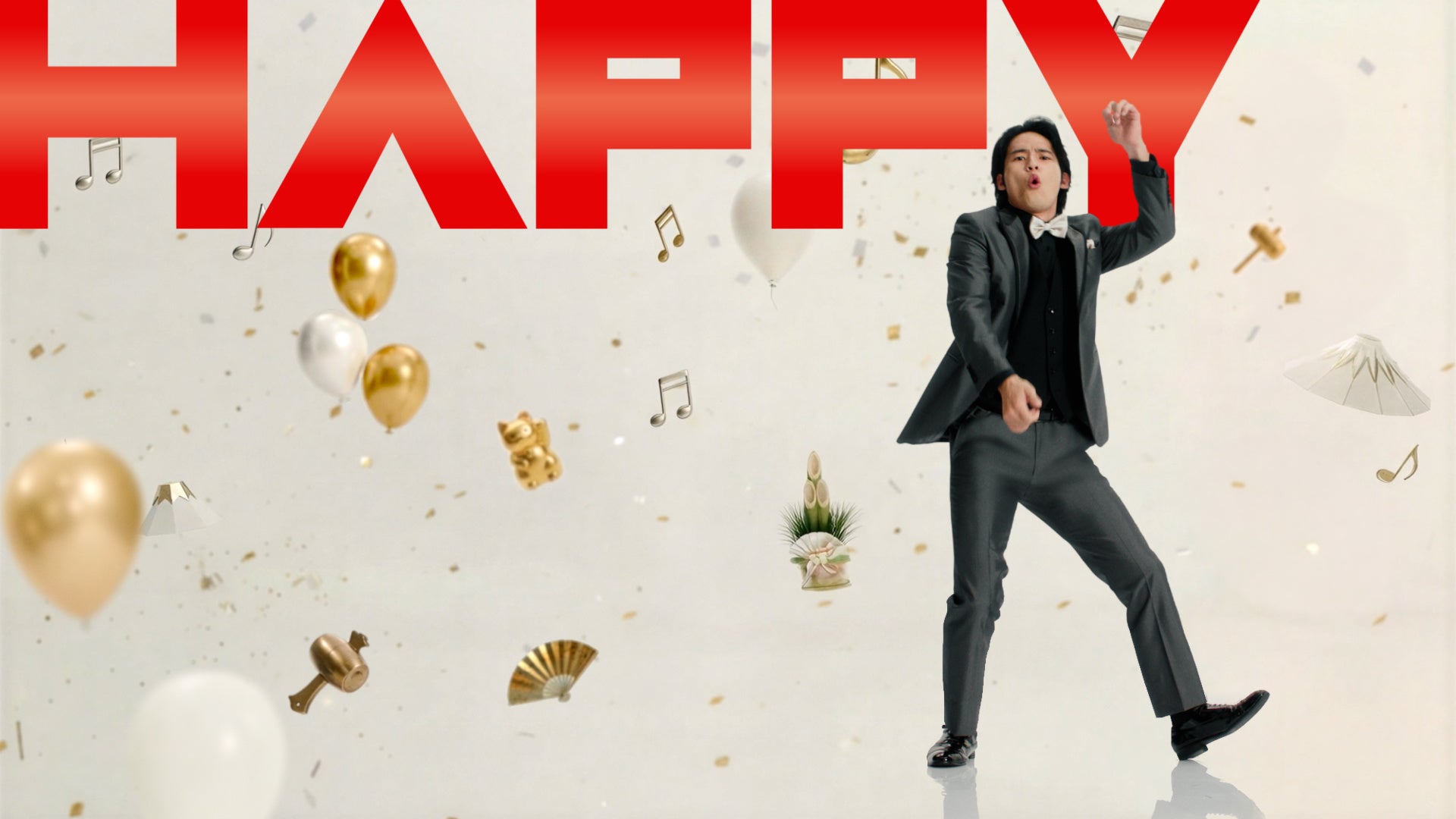 毎年、和の装いで年末年始を彩ってきた新春初売りCMですが、今回は年末年始を祝う『ニューイヤー   パーティー』をテーマに、パーティードレスとタキシードに身を包み、ポップで華やかなCMとなりました。アドリブのダンスがメインで構成されており、撮影現場は終始、和気あいあいとした雰囲気で、思わず笑顔になってしまう素敵な映像になっています!