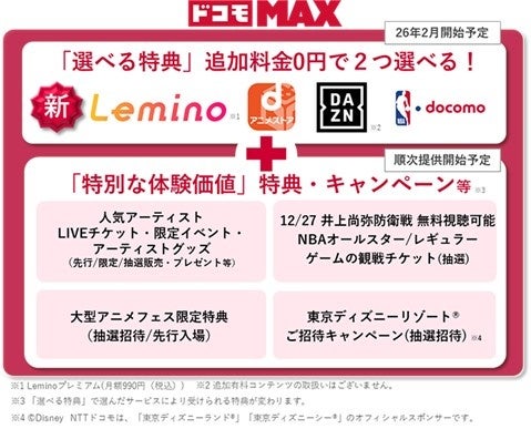 2026年2月より、「ドコモ MAX」「ドコモ ポイ活 MAX」プランをご契約のお客さまは、Leminoを追加料金なしで楽しめる「選べる特典」が始まります。