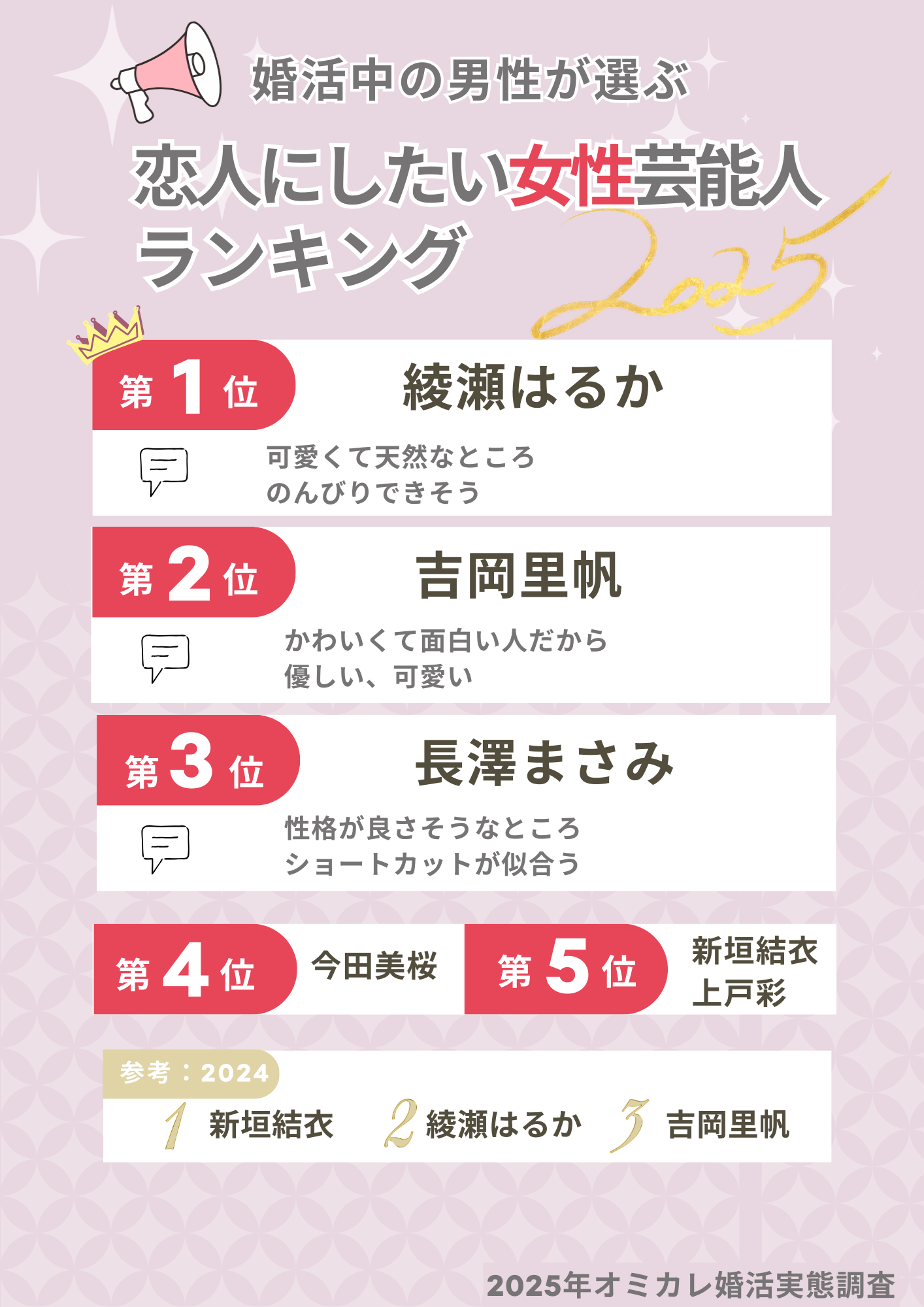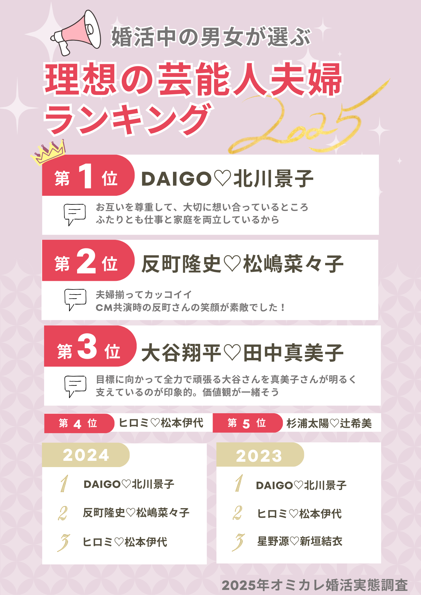 「#婚活といえばオミカレ」の婚活実態調査。875人の婚活男女に聞いた理想の芸能人夫婦ランキングから、「結婚」と「恋人」に求める違い、「憧れの女性像」などリアルな声で見えた令和の「理想の結婚」とは