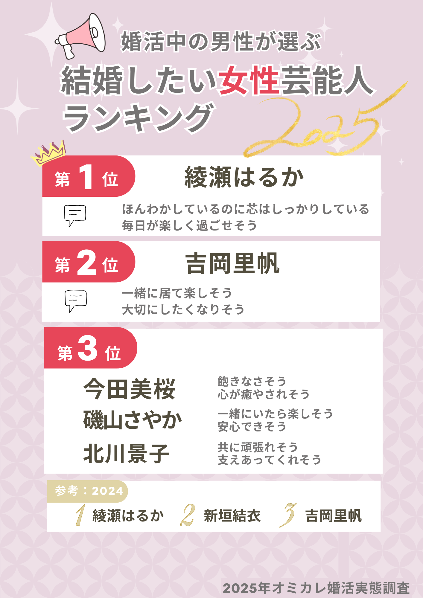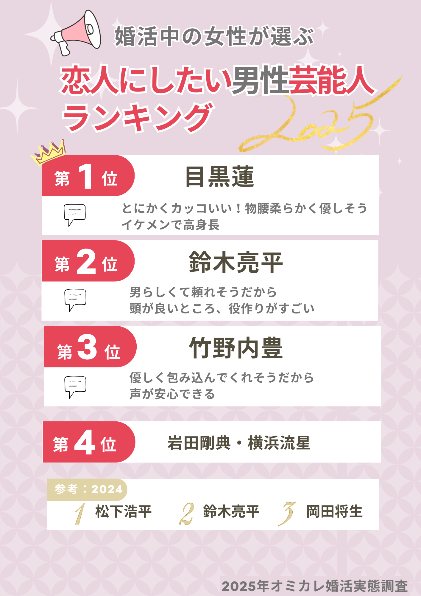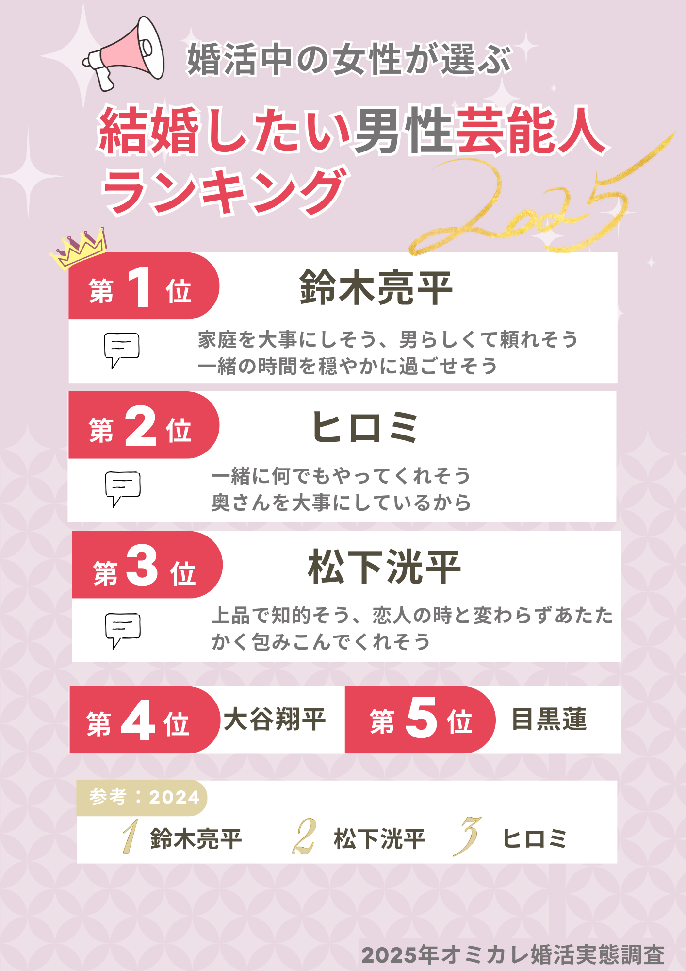 「結婚したい男性芸能人」ランキングでは、「ときめき」から一転、「安心」、「安定」、「生活力」という現実的な資質が重視されることが判明しました。
