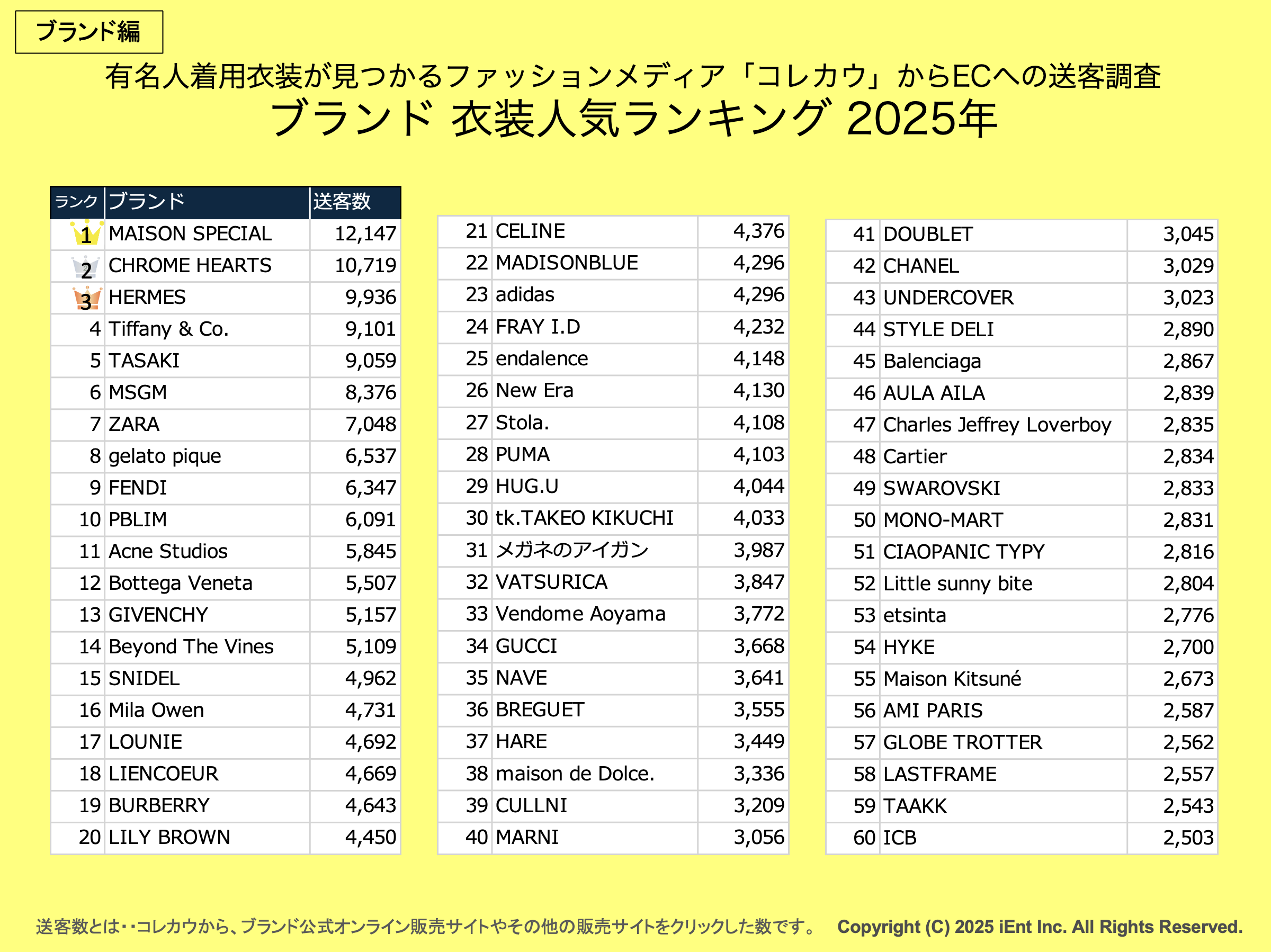 OMO(Online Merges with Offline)ソリューションを手掛けるアイエント株式会社(本社:東京都渋谷区神宮前、代表取締役 大森智人)は、ファッションに特化したEC支援やPRプラットフォームを開発・運営しており、自社サービス「コレカウ(有名人の着用衣装が見つかるファッションメディア)」のデータをもとに、2025年にテレビやSNSで注目を集めたタレント・番組・ブランドのファッション人気ランキングを発表しました。