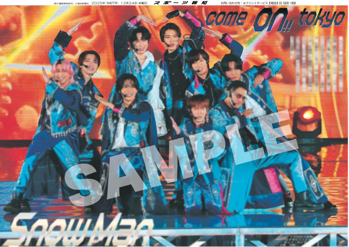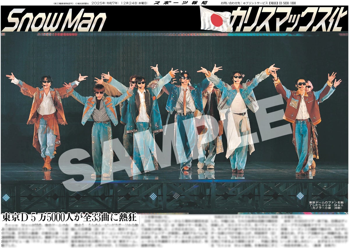 スポーツ報知を発行する報知新聞社(代表取締役社長・長谷川剛)は新聞の一部紙面をコンビニエンスストアのマルチコピー機からプリントできる「スポーツ報知コンビニプリント」サービスを展開中。スポーツ紙ならではの大きな写真を使った紙面をプリント版として販売しています。新たに12月24日付掲載、東京ドームで自身2度目の5大ドームツアー「ON」(5都市17公演、計78万人動員)の東京公演(4日連続開催)の初日を迎えたSnow Manの紙面を発売中です。全員バージョン3種類と各ソロバージョン9種類の合計12種類になります。