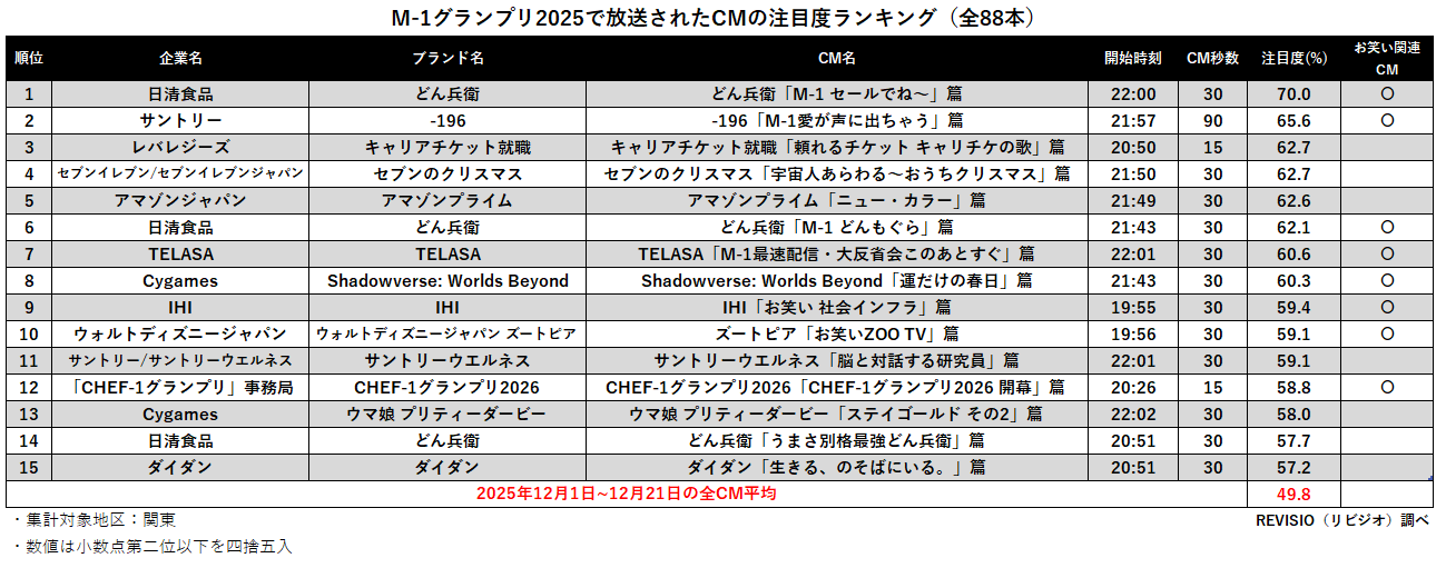 M-1ではここでしか見られないCMやお笑い要素の強いCMが多く放送されることも特徴です。1位の日清食品『どん兵衛「M-1 セールでね~」篇』は注目度70.0%という高い注目度を獲得していました。
