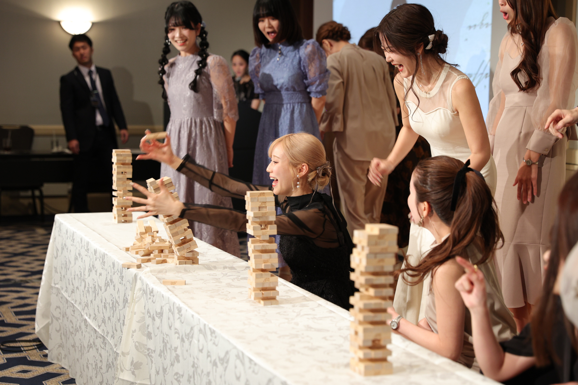 ラストゲームの「みんなで繋げ!グラグラジェンガ」では、1ブロック積み上げるごとにポイントが加算されるルールのもと、各チームのライバーがステージに登壇。制限時間ぎりぎりまで慎重にブロックを抜き、崩さないように積み上げていく様子に、会場からは声援や歓声が飛び交いました。