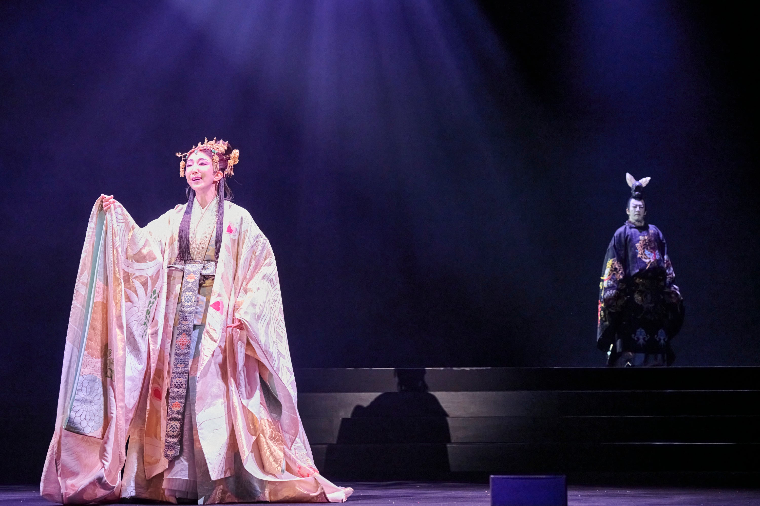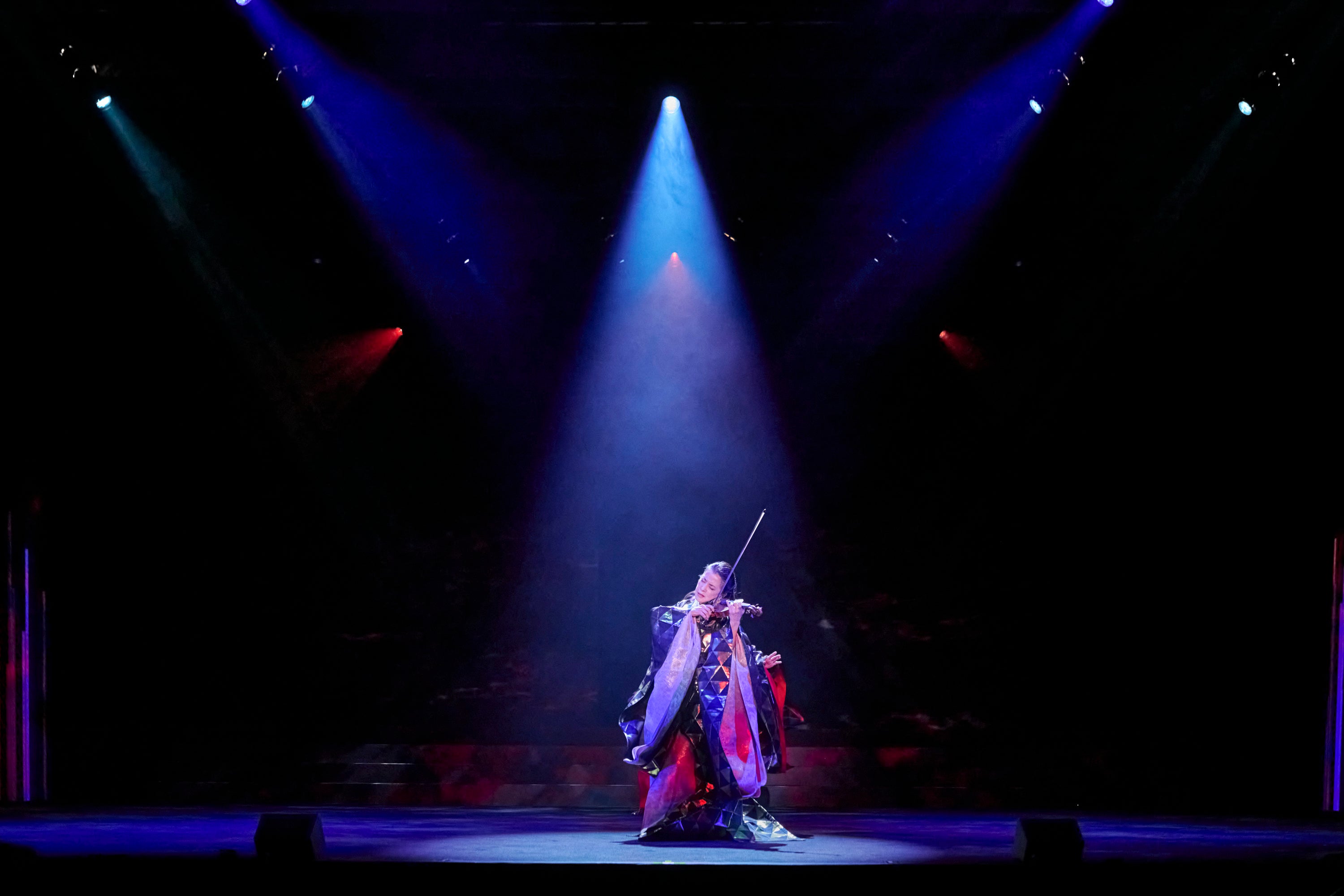 物語は、2025年の穢れを祓い、2026年を寿ぐ、神職による修祓から始まります。そして、イザナギとイザナミの国生み、神産みを神秘的に描いていきます。歌舞伎をベースにしながらも、ヴァイオリンをはじめとした洋楽器による演奏やミュージカルのような壮大な楽曲の歌唱、踊り、和太鼓と様々なパフォーマンスが続き、それぞれの出演者たちの魅力を存分に感じられる公演となっています。劇中には、瓊瓊杵尊(佐藤)たちによる、「瓊杵尊の物語」を解説・紹介する場面もあるため、古事記や日本神話を知らなくても物語を楽しめます。石見神楽と岩長姫の“大蛇タンゴ”、石見神楽の須佐之男と右近が演じる須佐之男が相対する“二人スサノオ”、須佐之男による大立ち回りなど見どころもたくさん。古典芸能と音楽が合する舞台を余すところなく体感できる公演になっていました。