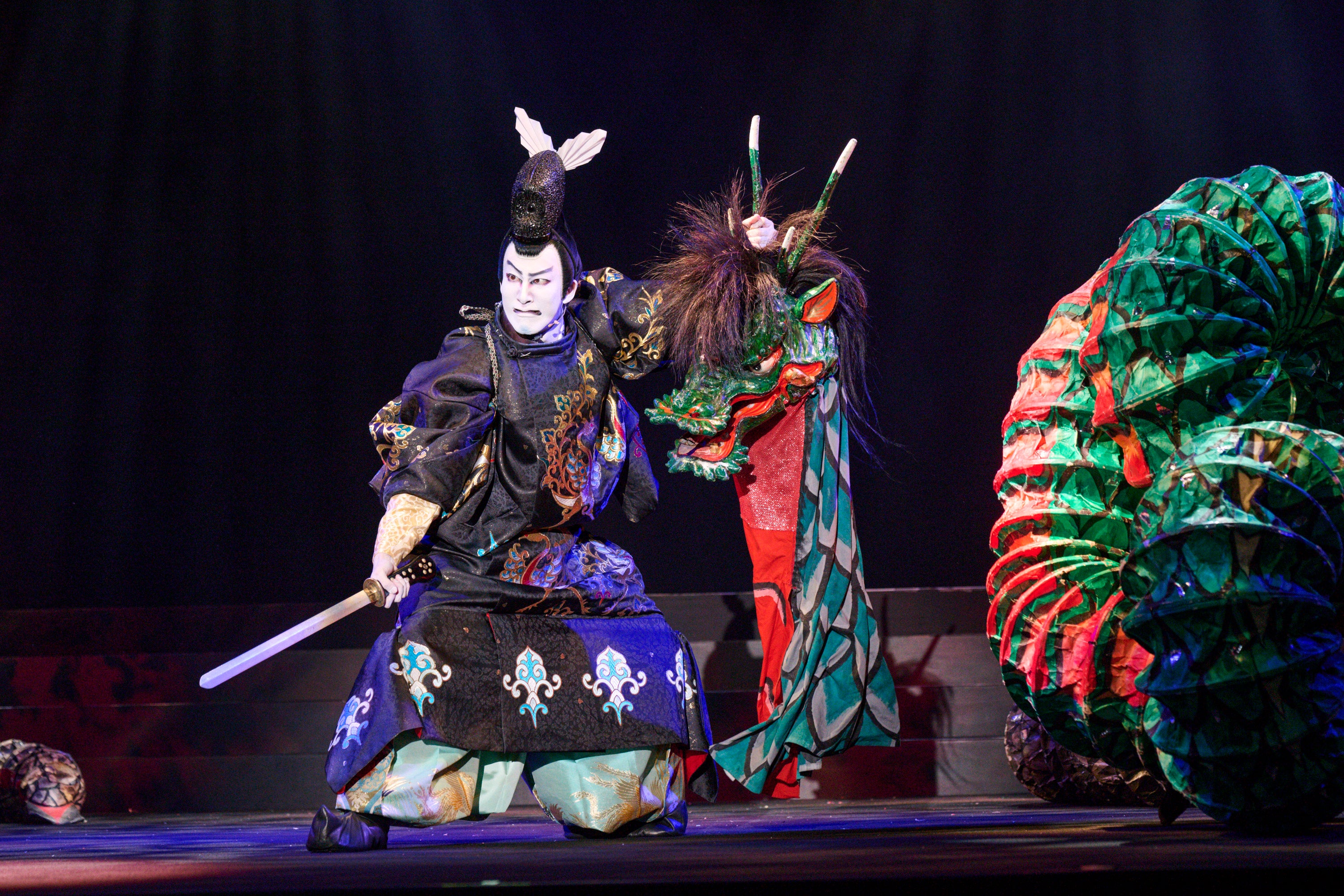そして、イザナキとイザナミの国生み、神産みを描いてゆく神秘的な幕開けより、黄泉へと去った母イザナミの穢れを濯いで生まれたスサノオが、舞台上で衣裳を纏い、隈を取り、大太刀を持って歌舞伎の荒事を見せ、荒む魂、荒御魂を現して天上へと踊り込みます。