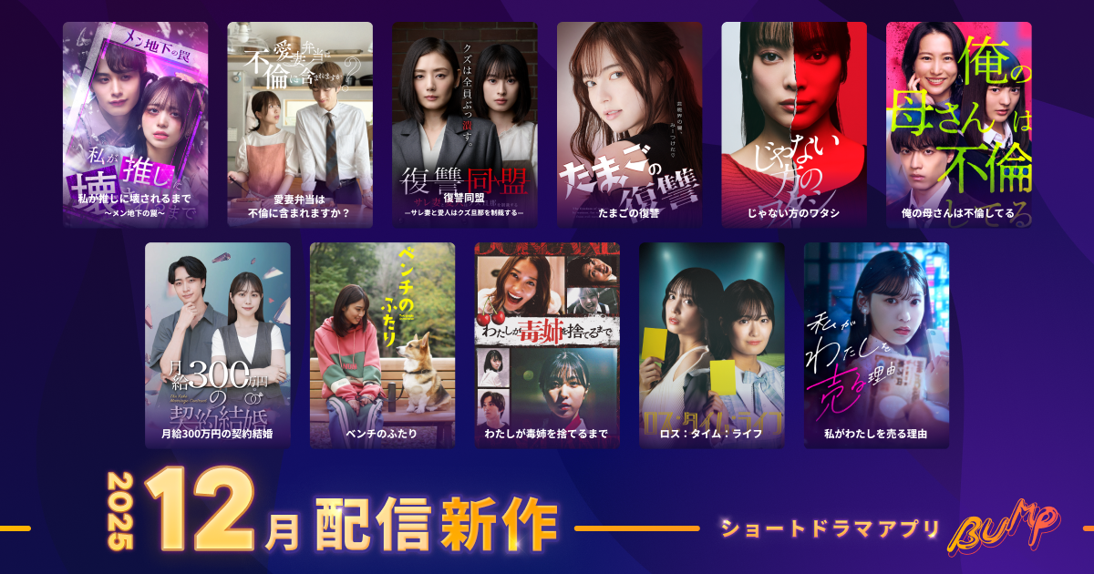 ショートドラマアプリ「BUMP」の開発・提供を行うemole株式会社(本社:東京都目黒区、代表取締役:澤村直道、以下、emole)は、「BUMP」にて、2025年12月、新作のショートドラマ作品11本、『私が推しに壊されるまで〜メン地下の罠〜』『愛妻弁当は不倫に含まれますか?』『復讐同盟—サレ妻と愛人はクズ旦那を制裁する—』『たまごの復讐』『じゃない方のワタシ』『俺の母さんは不倫してる』『月給300万円の契約結婚』『ベンチのふたり』『わたしが毒姉を捨てるまで』『ロス:タイム:ライフ』『私がわたしを売る理由』を配信開始いたしました。