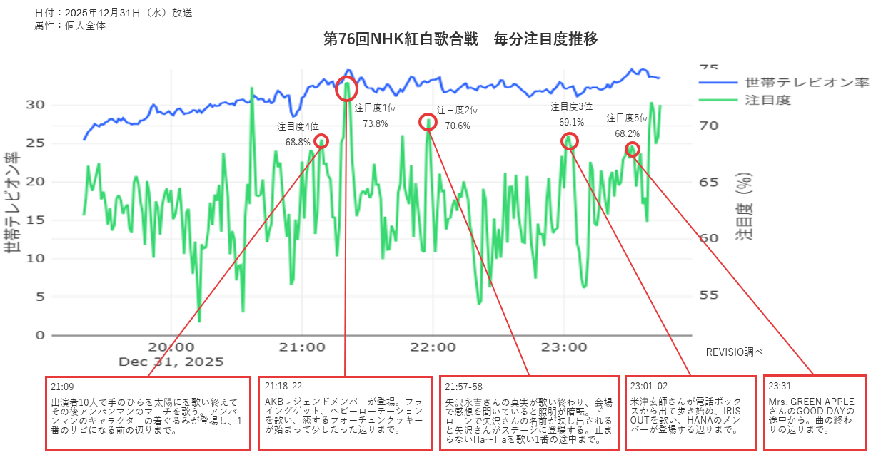 そんな2025年の紅白歌合戦で、視聴者が画面に「くぎづけ」になったのはどのシーンだったのでしょうか。REVISIOの注目度データで振り返ります。
